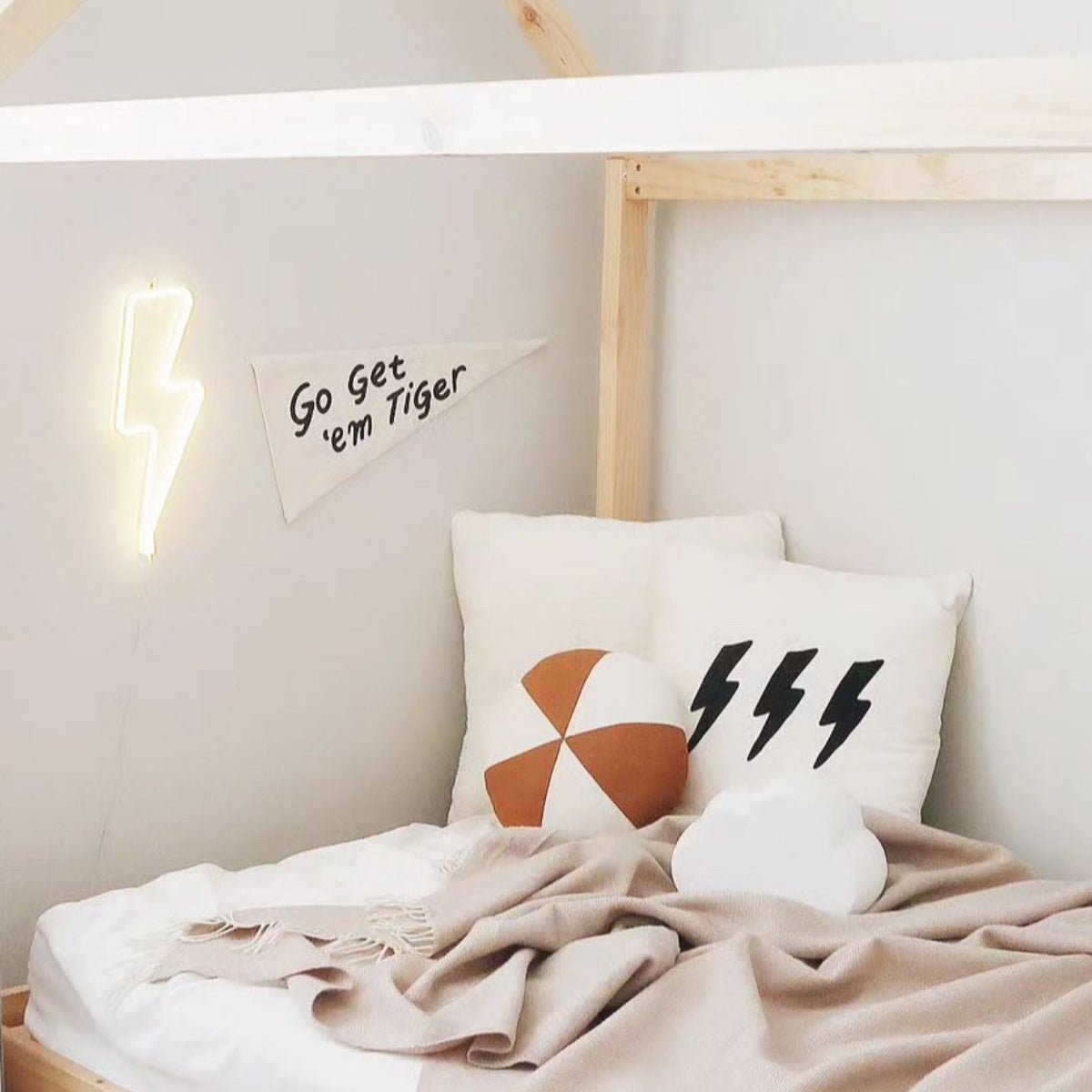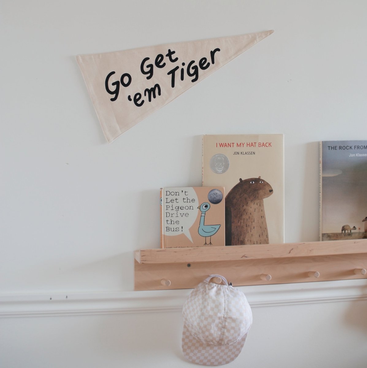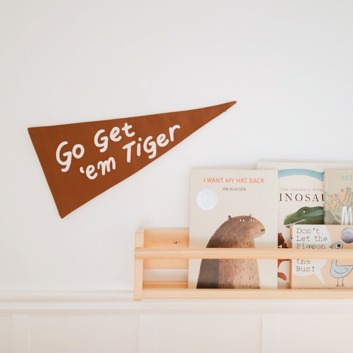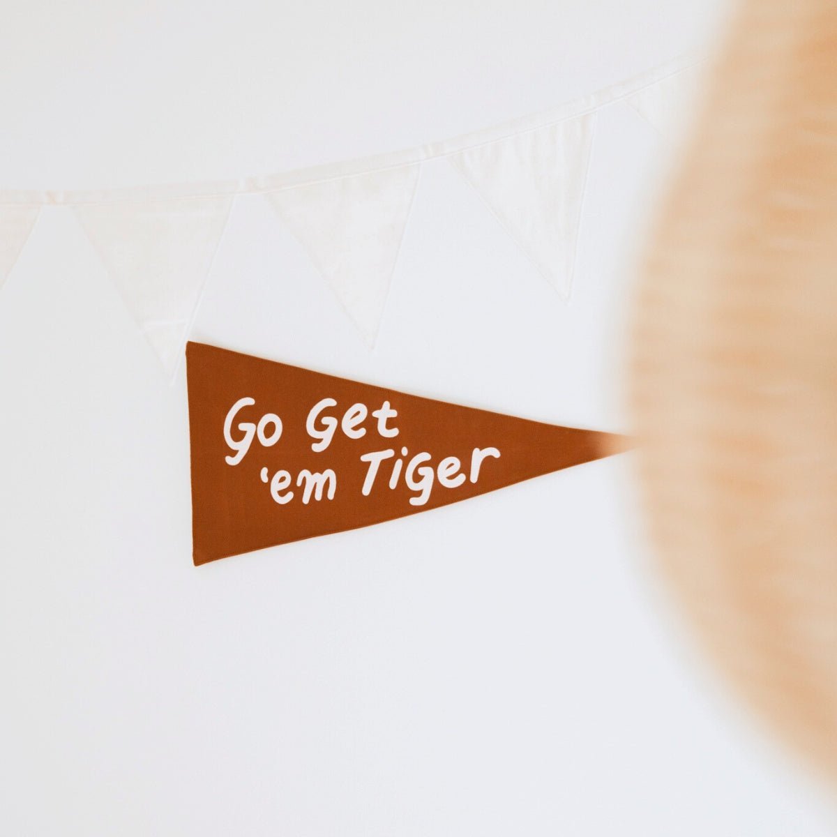 This handcrafted canvas pennant features the motivational message "Go Get 'Em Tiger" - perfect for inspiring confidence in any child's space. Each triangle wall flag is sewn and screen printed by hand on natural and rust canvas by skilled Kenyan artisans, making every piece unique.