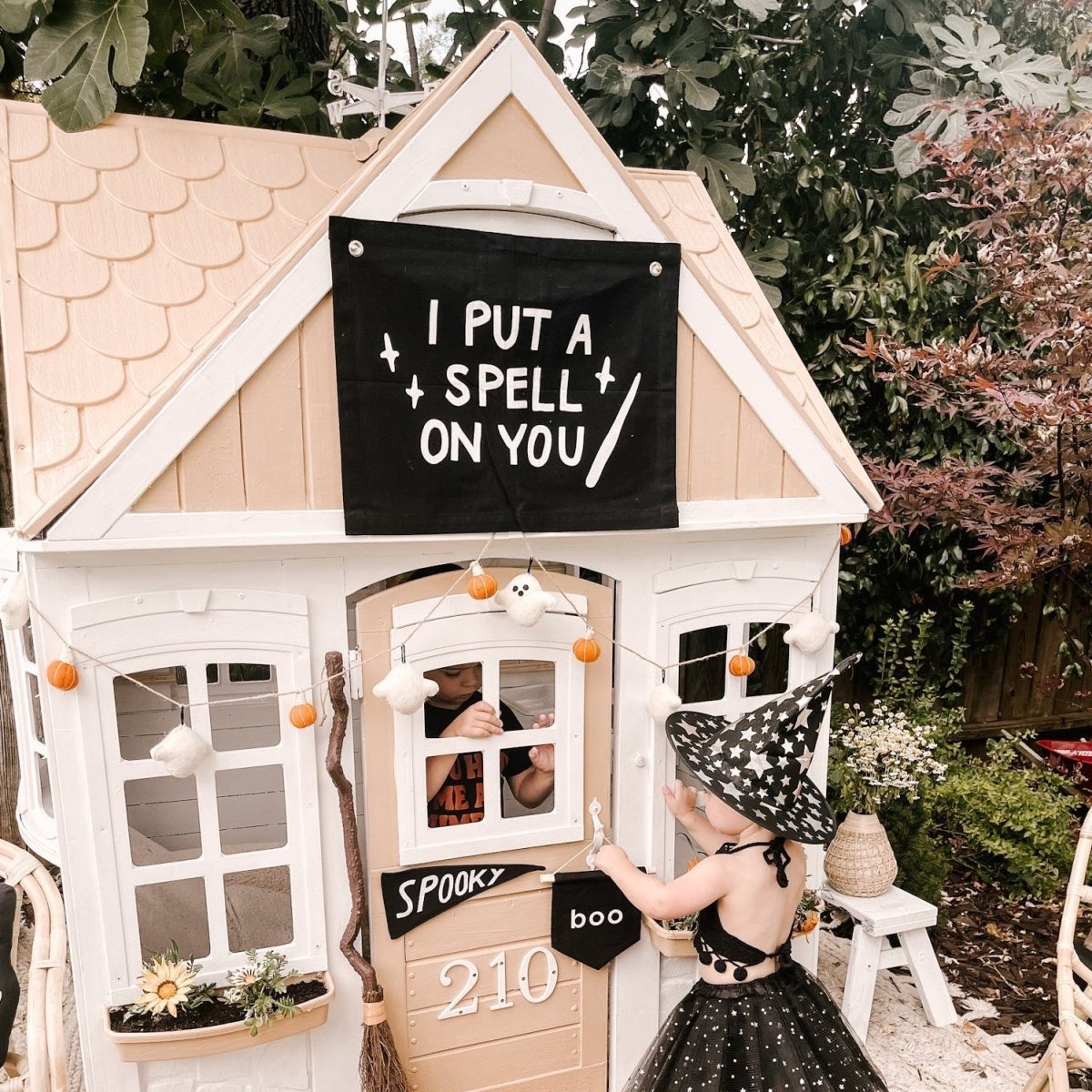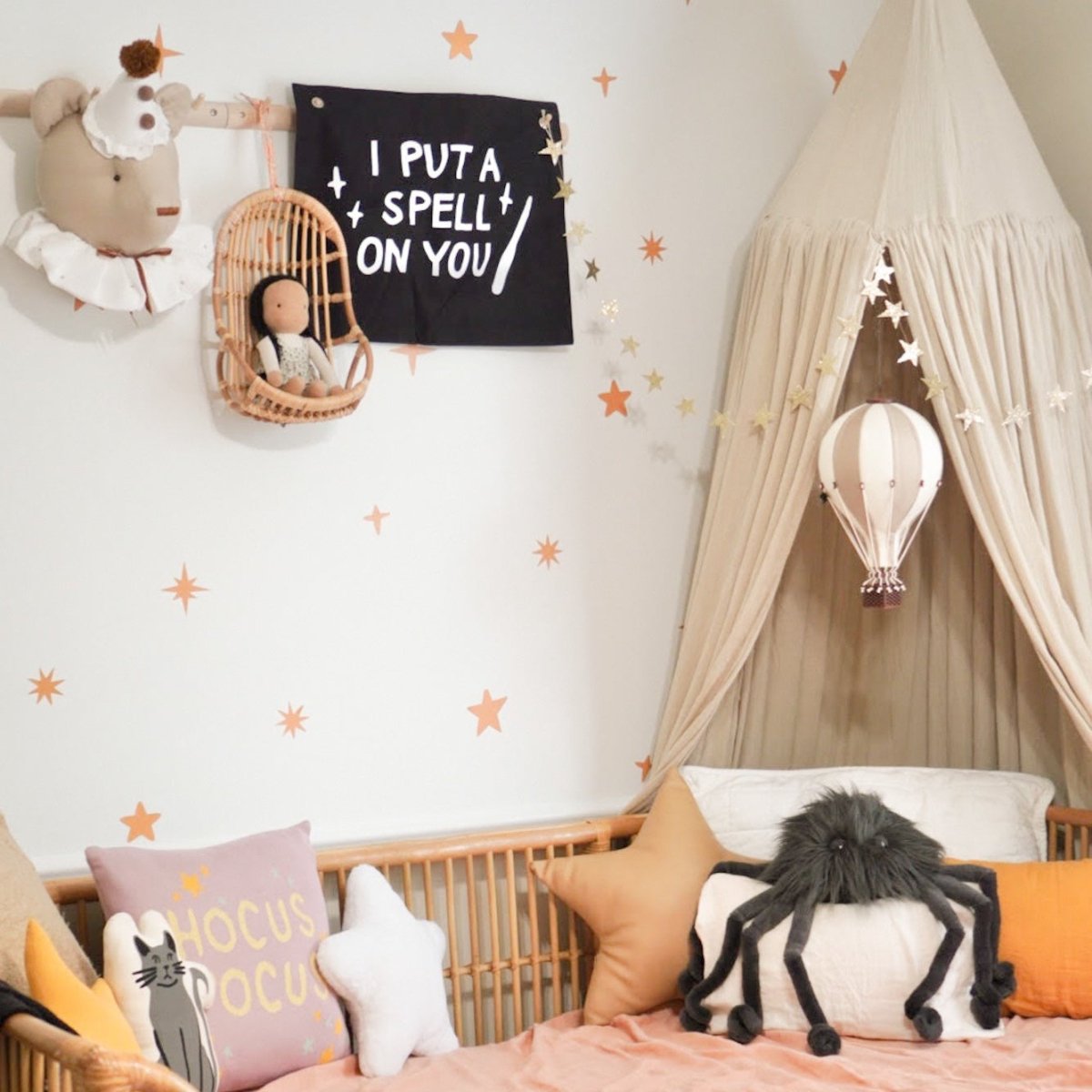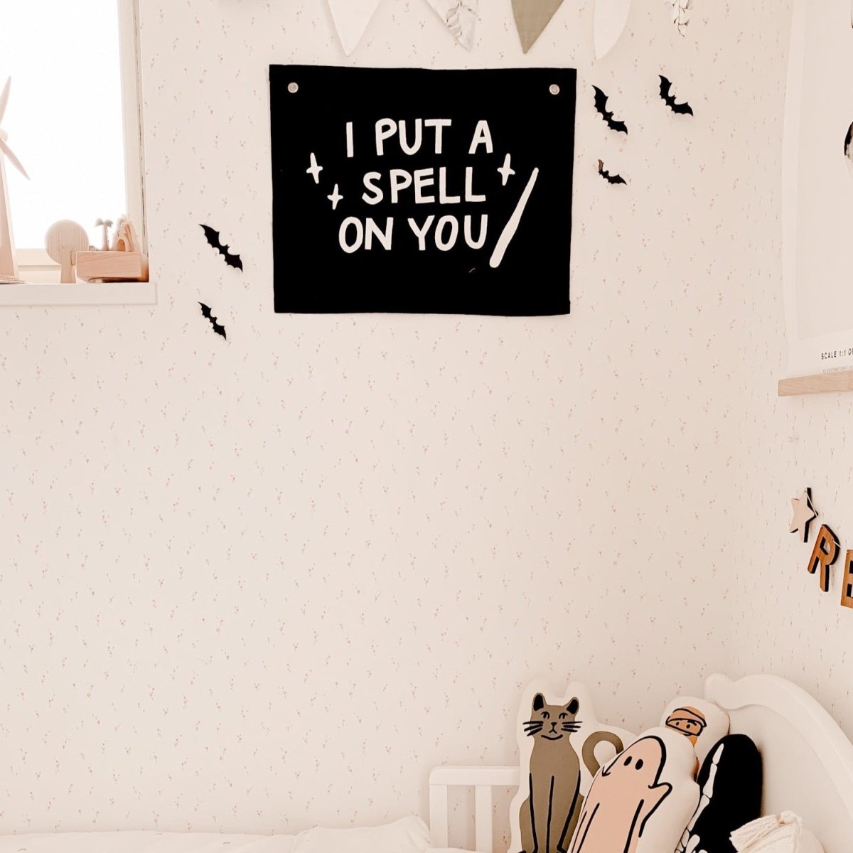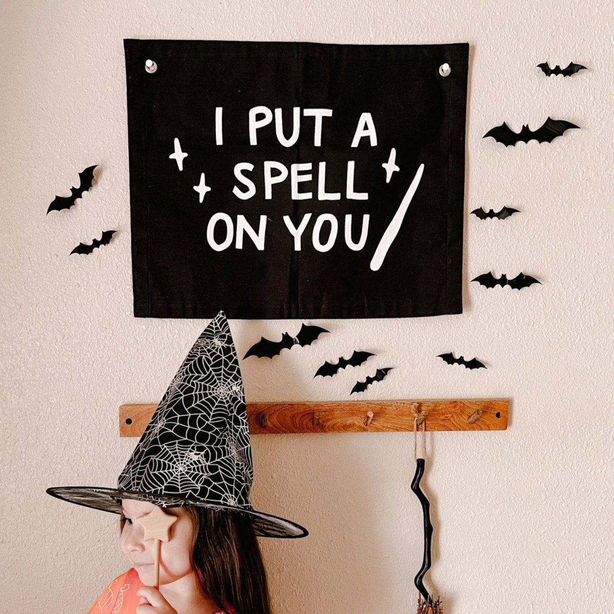 This handcrafted canvas banner brings a touch of magic to your Halloween decor. Featuring the playful phrase "I Put a Spell on You," this 16x20 inch wall flag combines festive spirit with artisan craftsmanship. Each banner is sewn and screen printed by hand on natural canvas by skilled Kenyan artisans, making every piece unique.