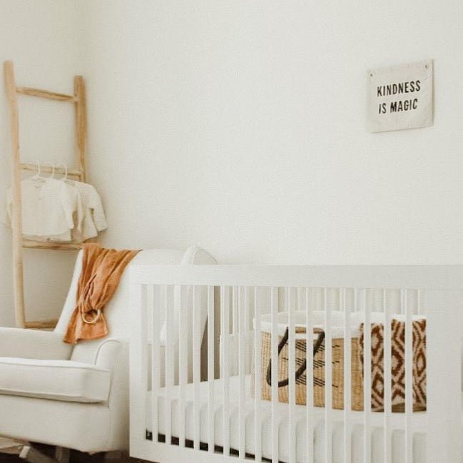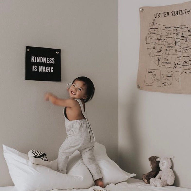 This Kindness Is Magic canvas banner combines inspirational messaging with authentic handcrafted quality. Each wall hanging is sewn and screen printed by hand by skilled Kenyan artisans, making every piece unique. The banner features the uplifting message "Kindness Is Magic" on durable canvas material, designed to inspire positive values in children's spaces.
