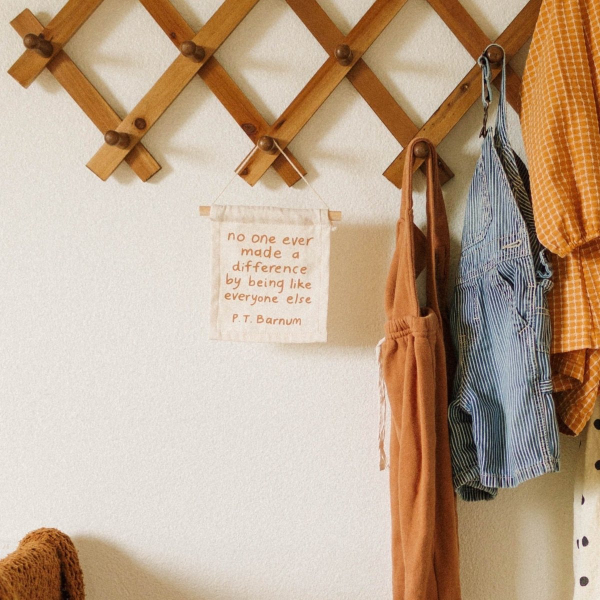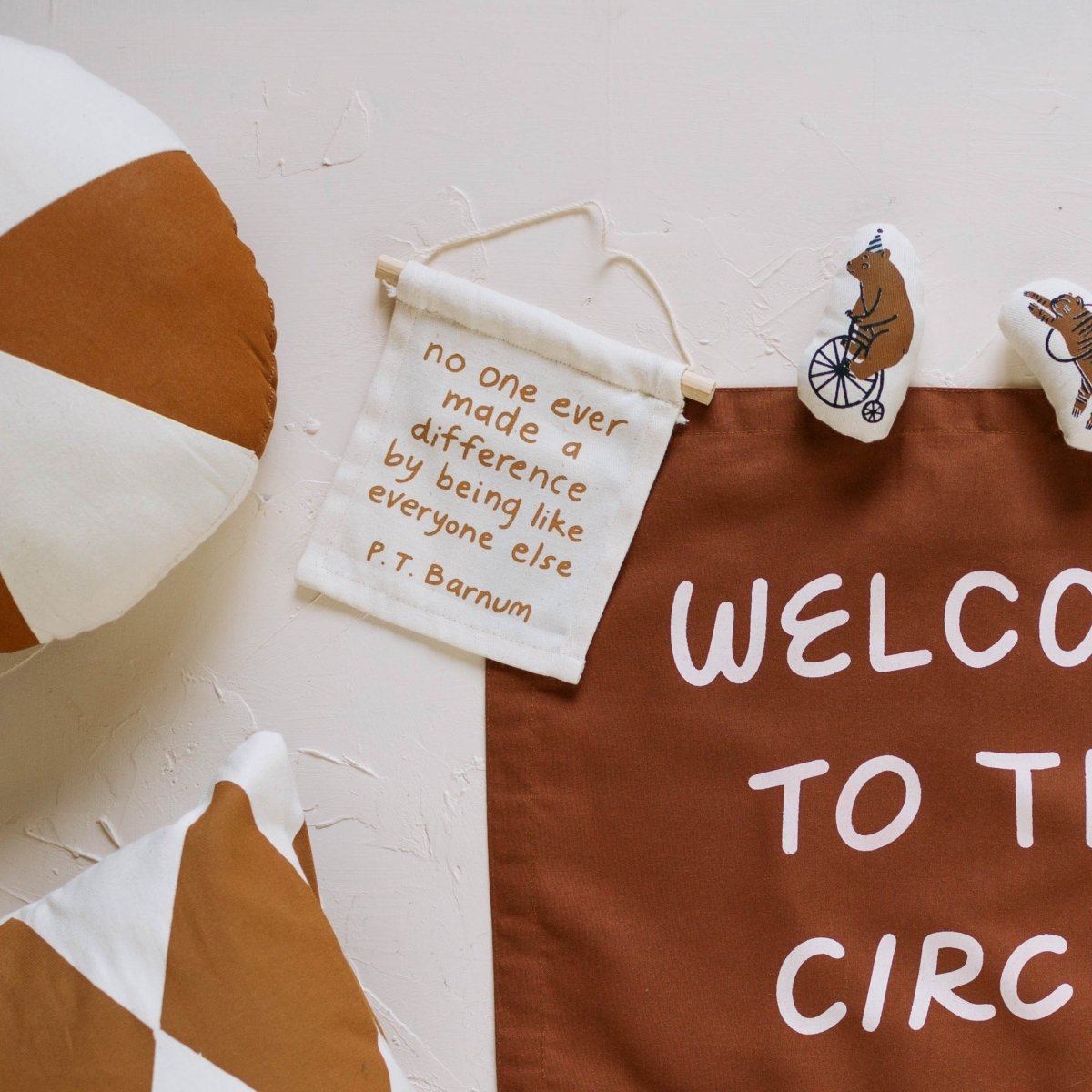 This P.T. Barnum hang sign features a rust screen print on natural canvas, handcrafted by Kenyan artisans. Each piece is individually sewn and screen printed by hand, making every sign unique. The natural canvas material provides an authentic, rustic aesthetic that complements boho and traditional nursery designs.
