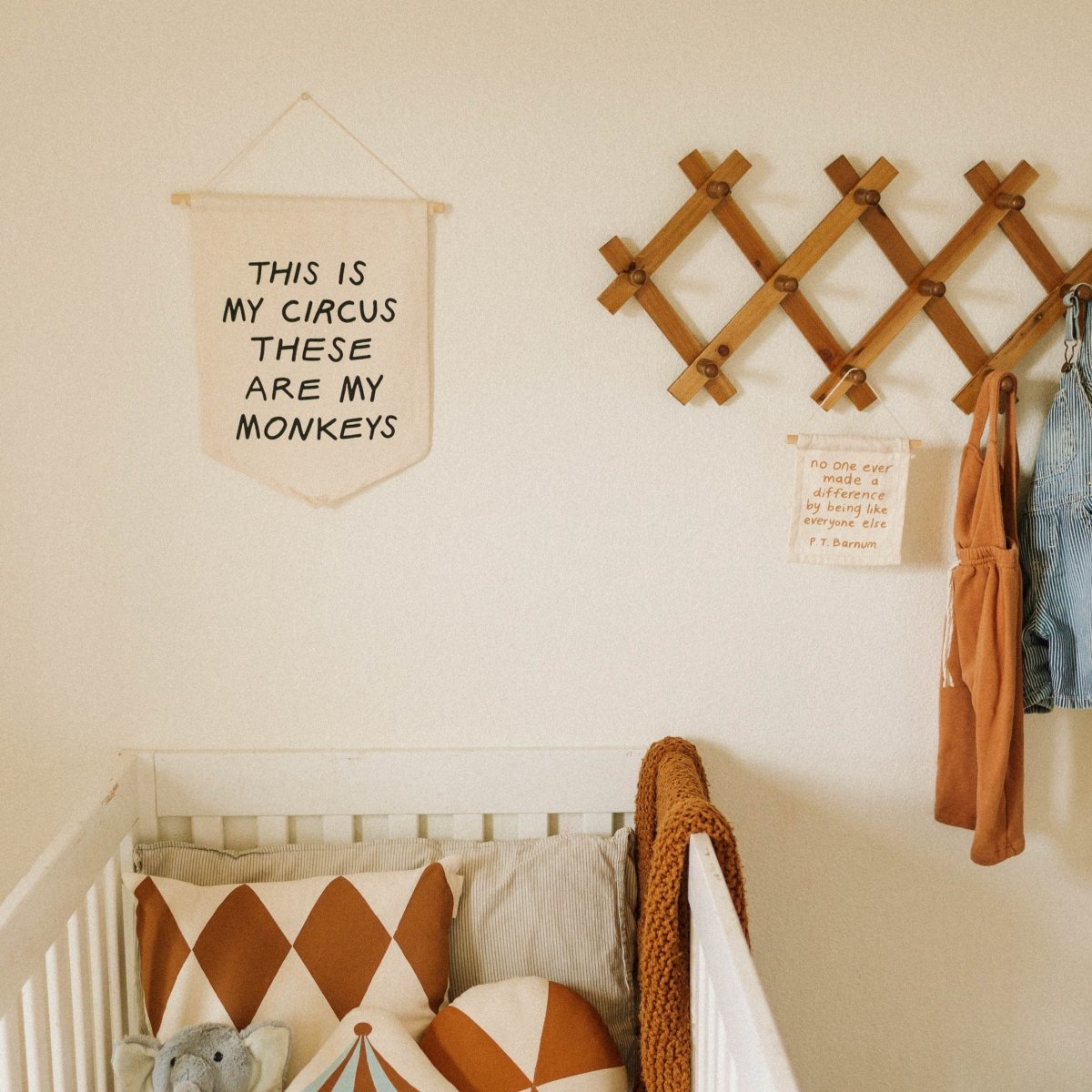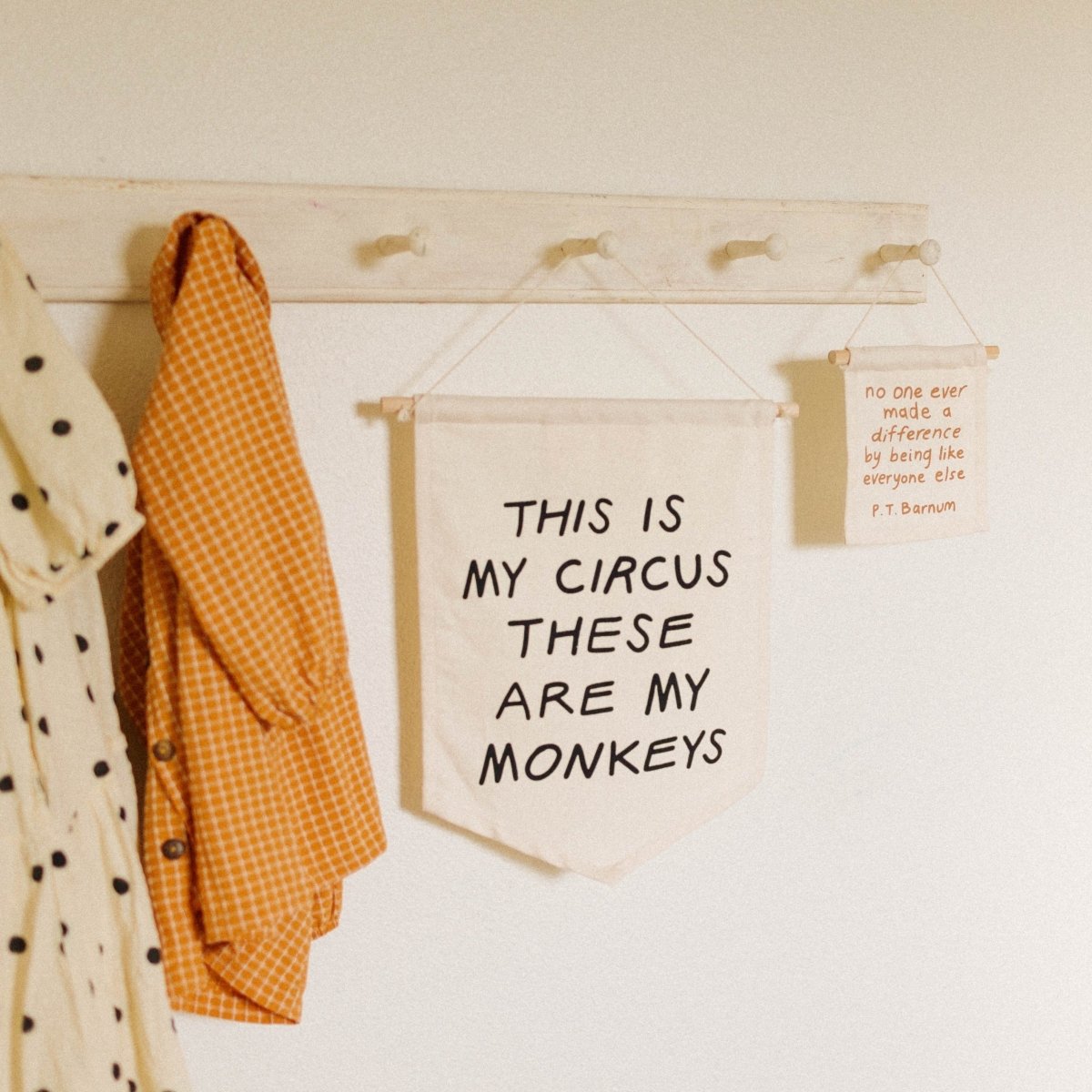 This "This is my circus" canvas hang sign brings humor and personality to nursery walls and children's spaces. Screen printed by hand on natural canvas, each piece is crafted by Kenyan artisans using traditional techniques.
