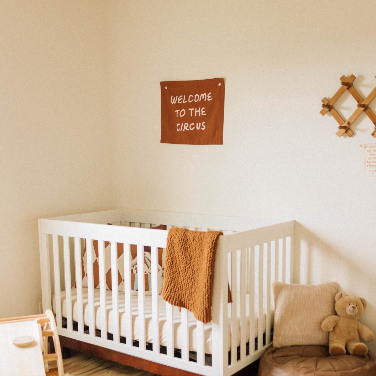 The gender-neutral design and circus theme work well in various settings - from nurseries to playrooms to party decorations. The rust canvas provides a warm, earthy backdrop that complements both modern and traditional decor styles.