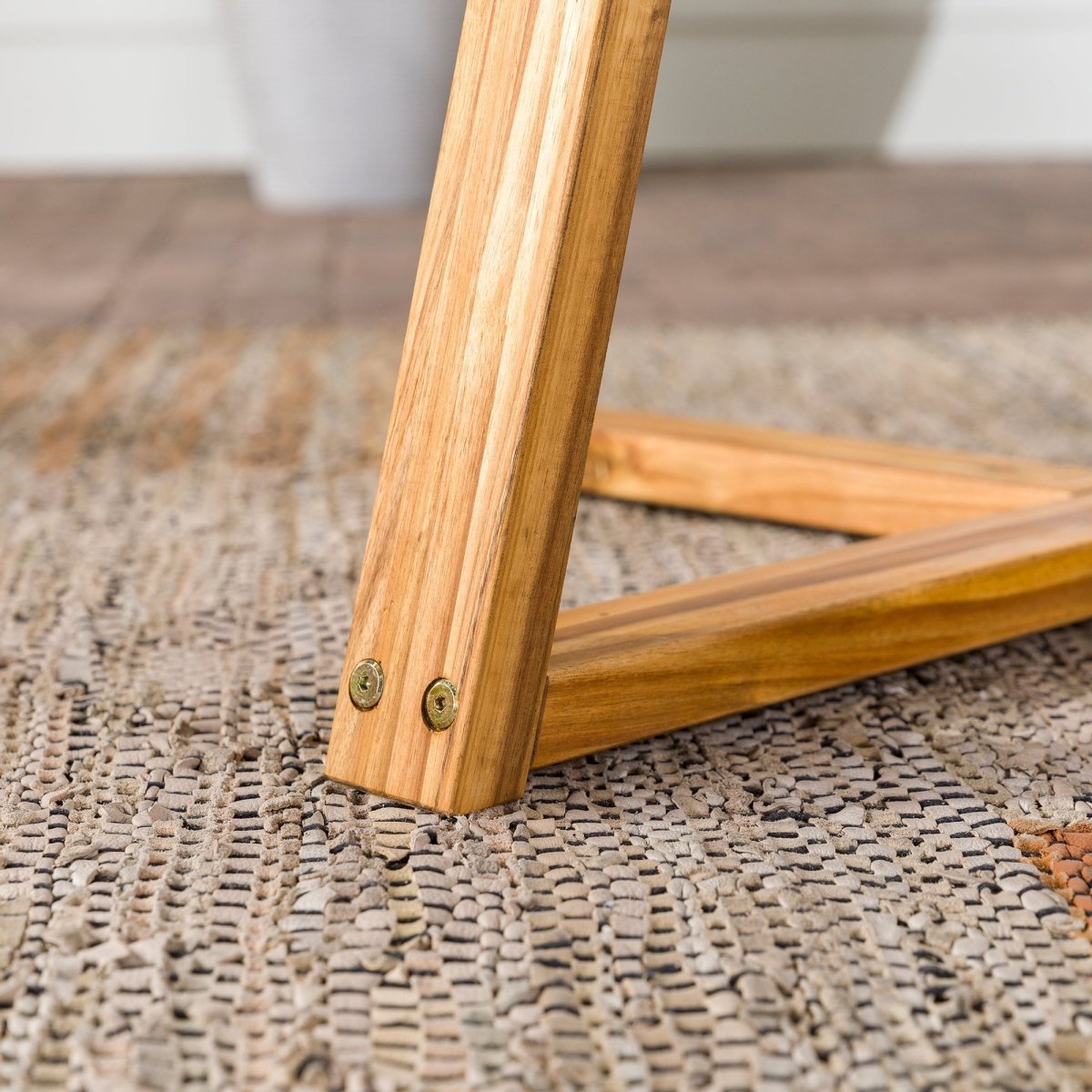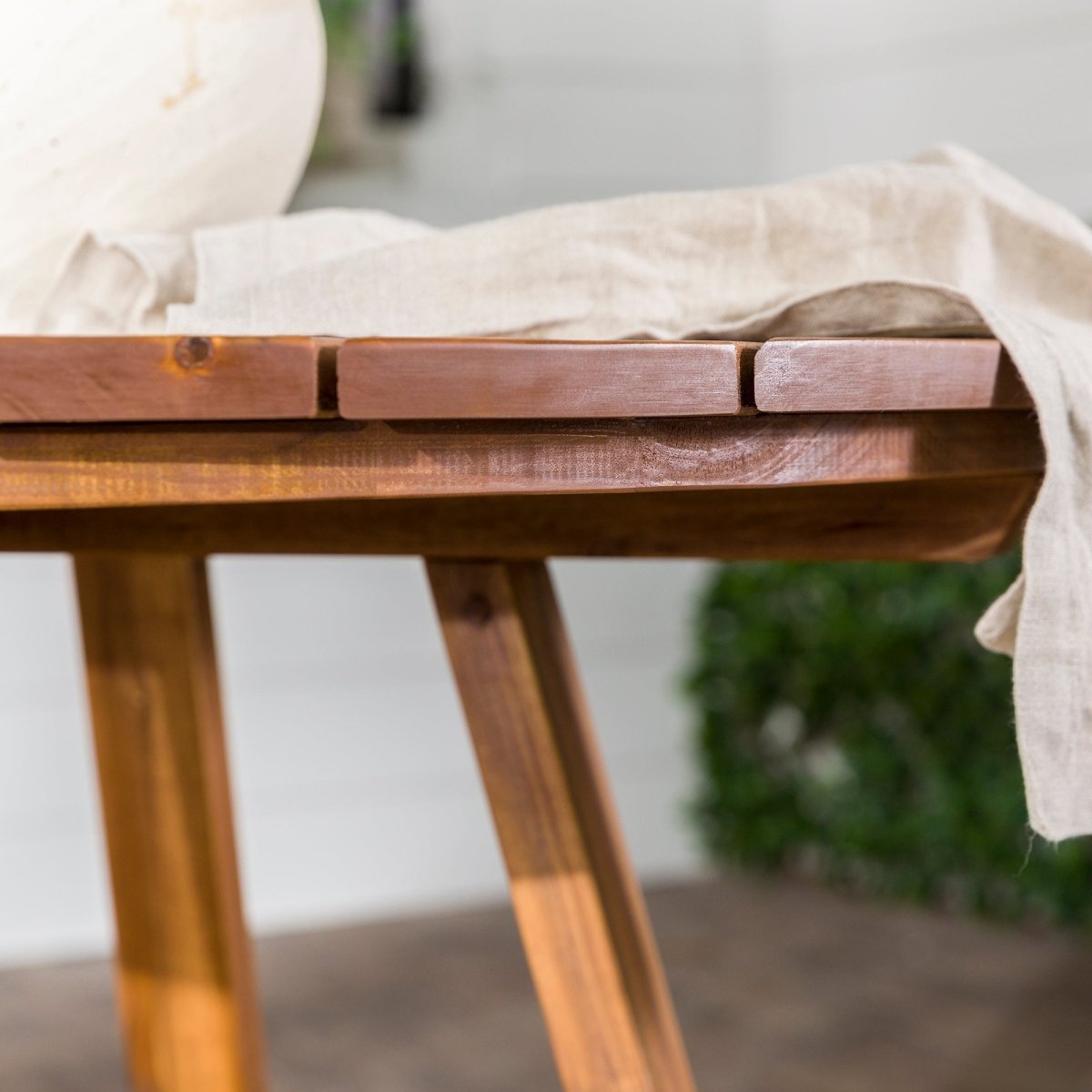 Sleek, simple, and oh-so-stylish, this round outdoor dining table is just what you need to craft a patio paradise. With its slatted top and unique A-frame legs, this table is the perfect perch to make your get-togethers, backyard barbeques, and family nights both aesthetic and functional. Invite up to six of your loved ones to gather ‘round the table, and host up to 100 pounds of yummy food and décor on its tabletop. Whether it’s displayed inside our outdoors, this dining table will effortlessly upgrade your favorite space.