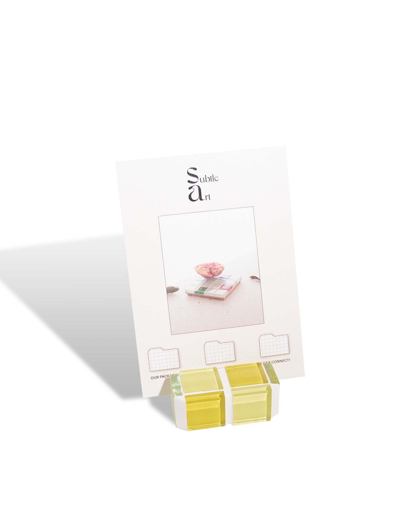 Add a touch of modern elegance to your space with this mini glass tile picture stand in banana yellow hues—a handcrafted mini display block designed to beautifully hold your favorite photos, cards, or small signs. Each piece is made from high-quality glass tile and natural wood, offering both durability and a unique aesthetic. Whether you're displaying treasured memories, business cards, or table numbers, this glass tile photo holder is a stylish and functional addition to any home, office, or event setup.