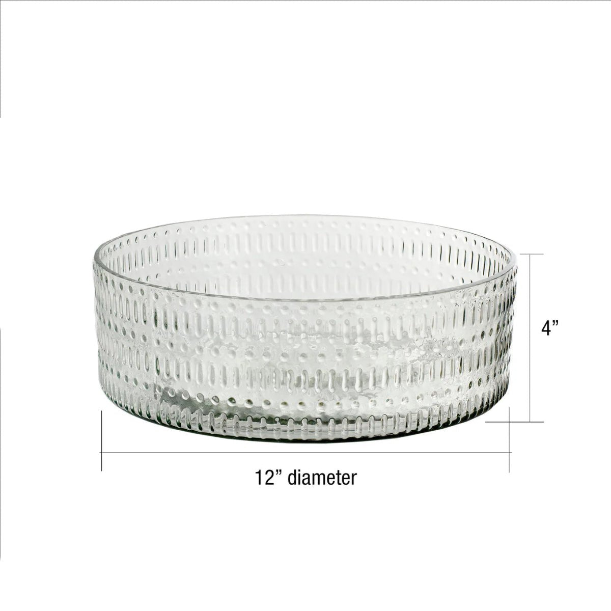 Crafted from 100% glass with approximately 50% recycled content, this serving bowl combines environmental responsibility with practical design. The textured dot-dash pattern creates visual interest while providing a secure grip when handling. The clear glass construction allows your salads, sides, and dishes to become part of the presentation.
