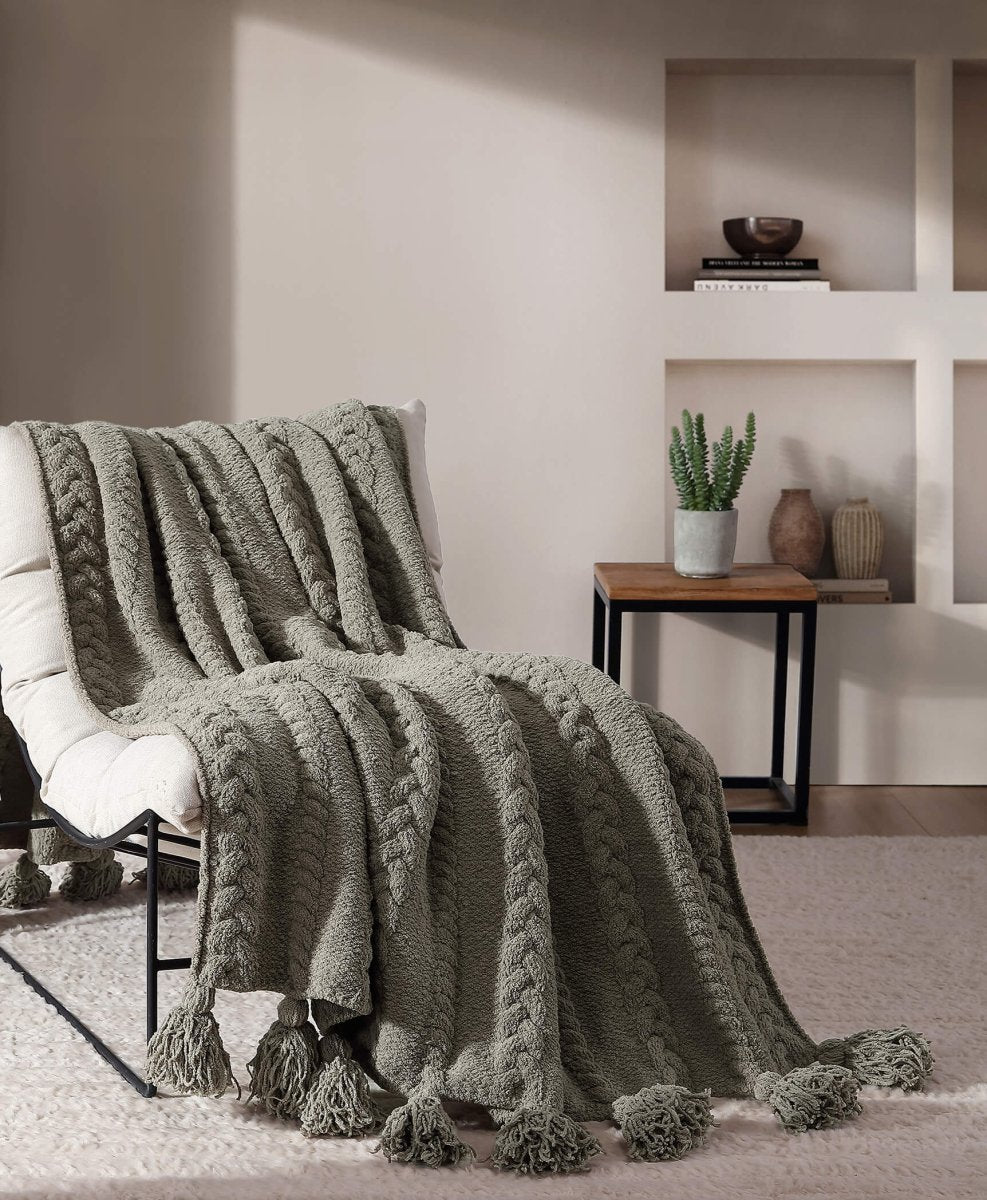 The braided pattern creates visual depth and textural interest, transforming a standard throw into a statement piece. Pom pom balls line the edges, adding a decorative detail that enhances both the look and feel. The combination of braided texture and pom pom accents makes this throw suitable for draping over furniture or using during lounging.
