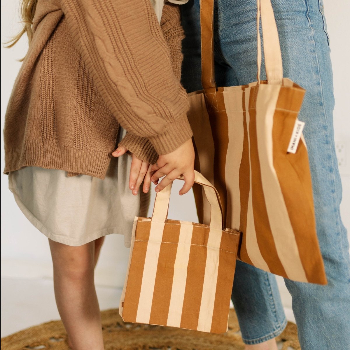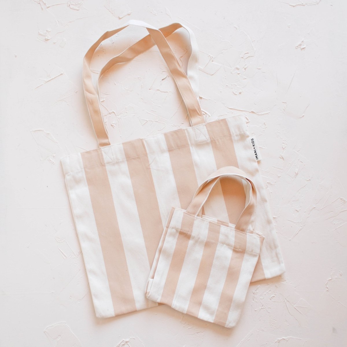 The large tote measures 16 inches by 14 inches, providing ample space for mom's essentials, groceries, or beach gear. The mini tote measures 8 inches by 8 inches, perfectly proportioned for children to carry their own toys, snacks, or small treasures. Both bags feature the same striped screen print design available in natural/pink or rust/pink color combinations.