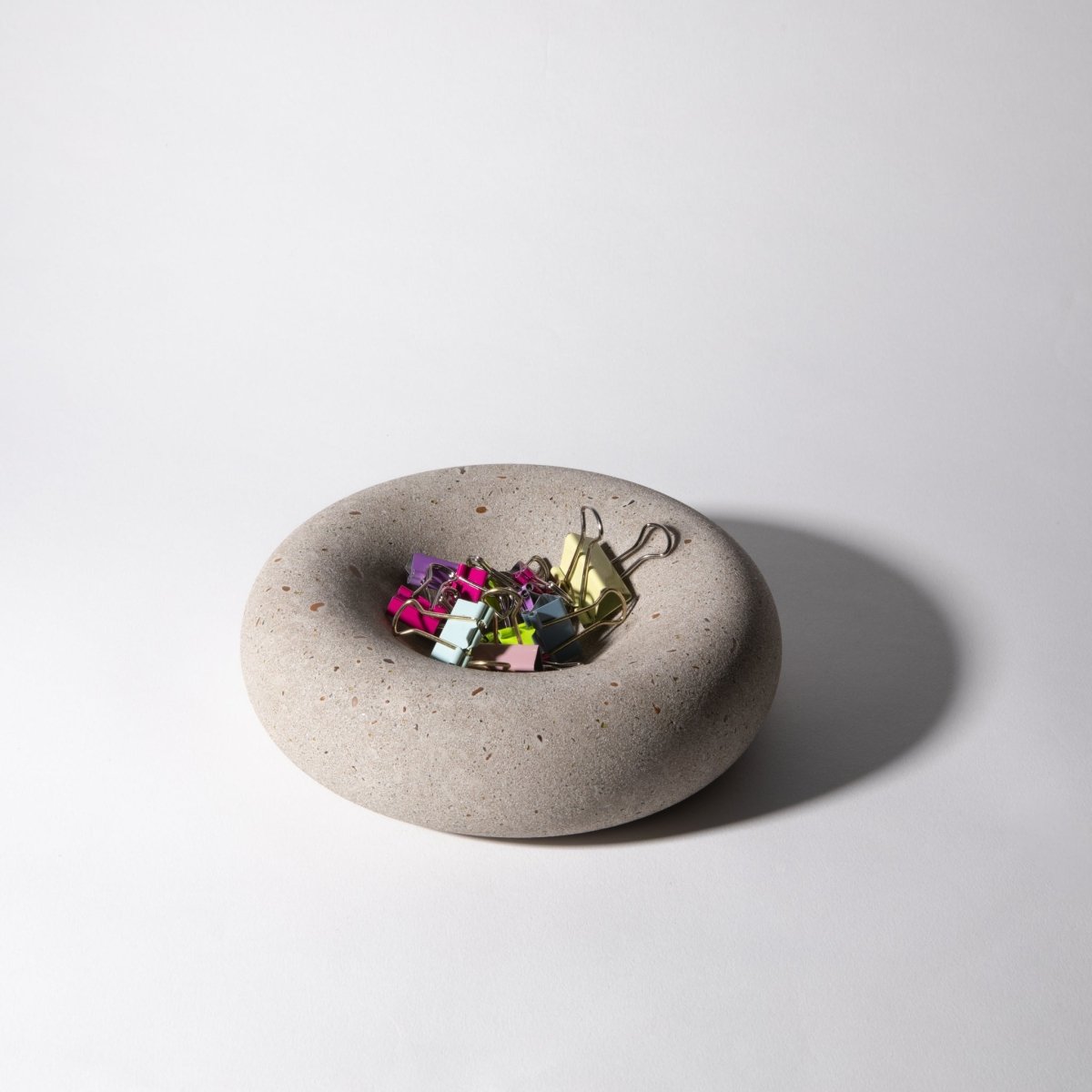 Crafted from a durable blend of concrete and recycled glass, and finished with a cork base to protect surfaces, this trinket dish is ideal for catching keys, coins, jewelry, or everyday clutter with style. Its 6” width and 1.8” height give it a presence that's both practical and artful, making it a versatile accent for desks, nightstands, entryways, or coffee tables.