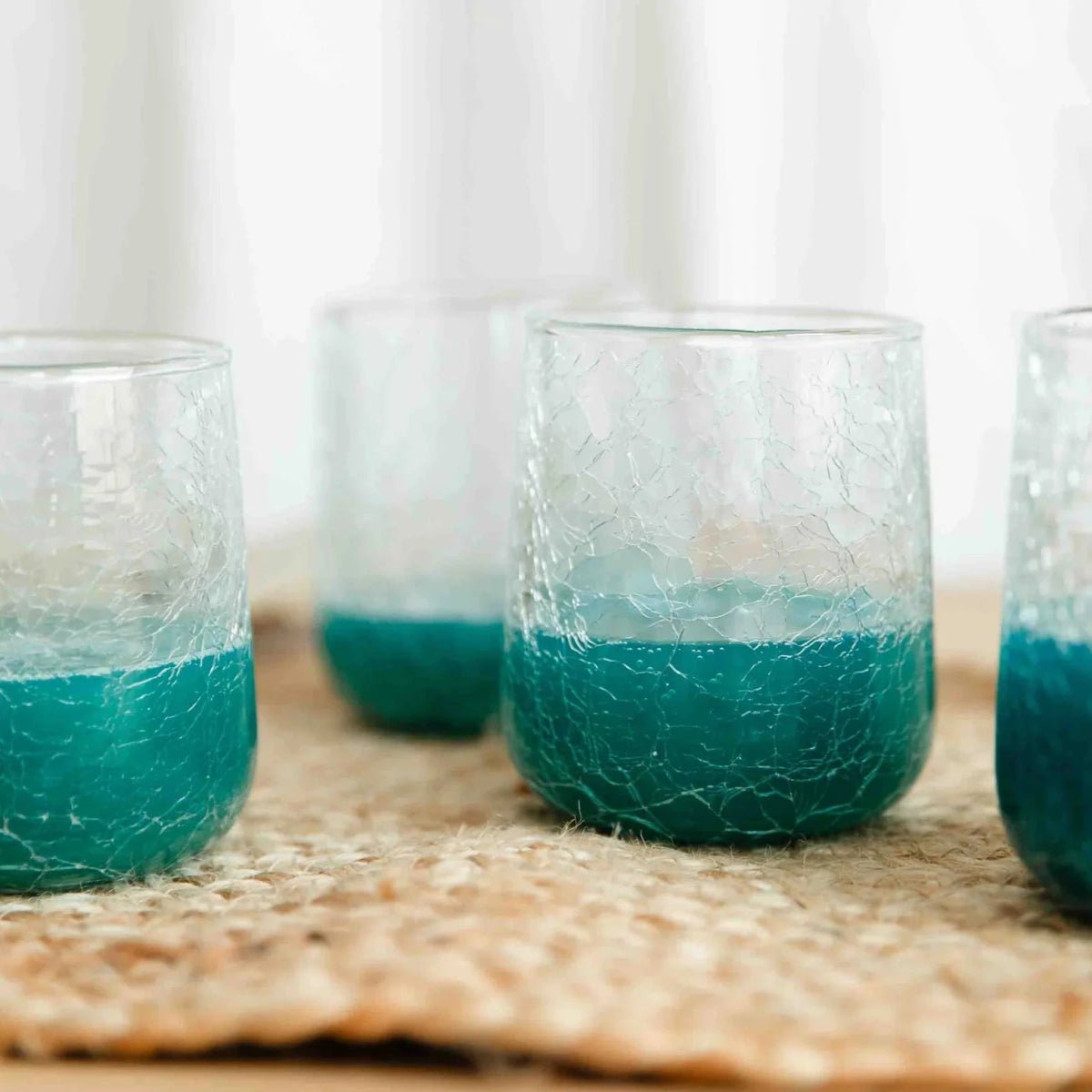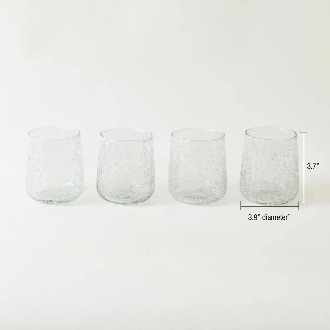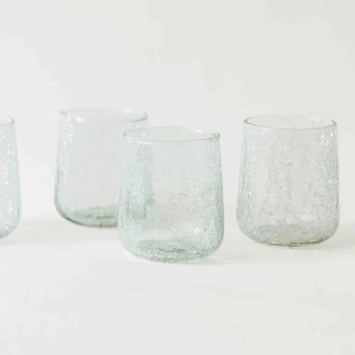 Each goblet is individually mouth blown, creating the signature cracked glass finish that distinguishes these pieces from standard drinkware. The manufacturing process results in slight variations between glasses, making each piece unique while maintaining consistent quality and functionality across the set.