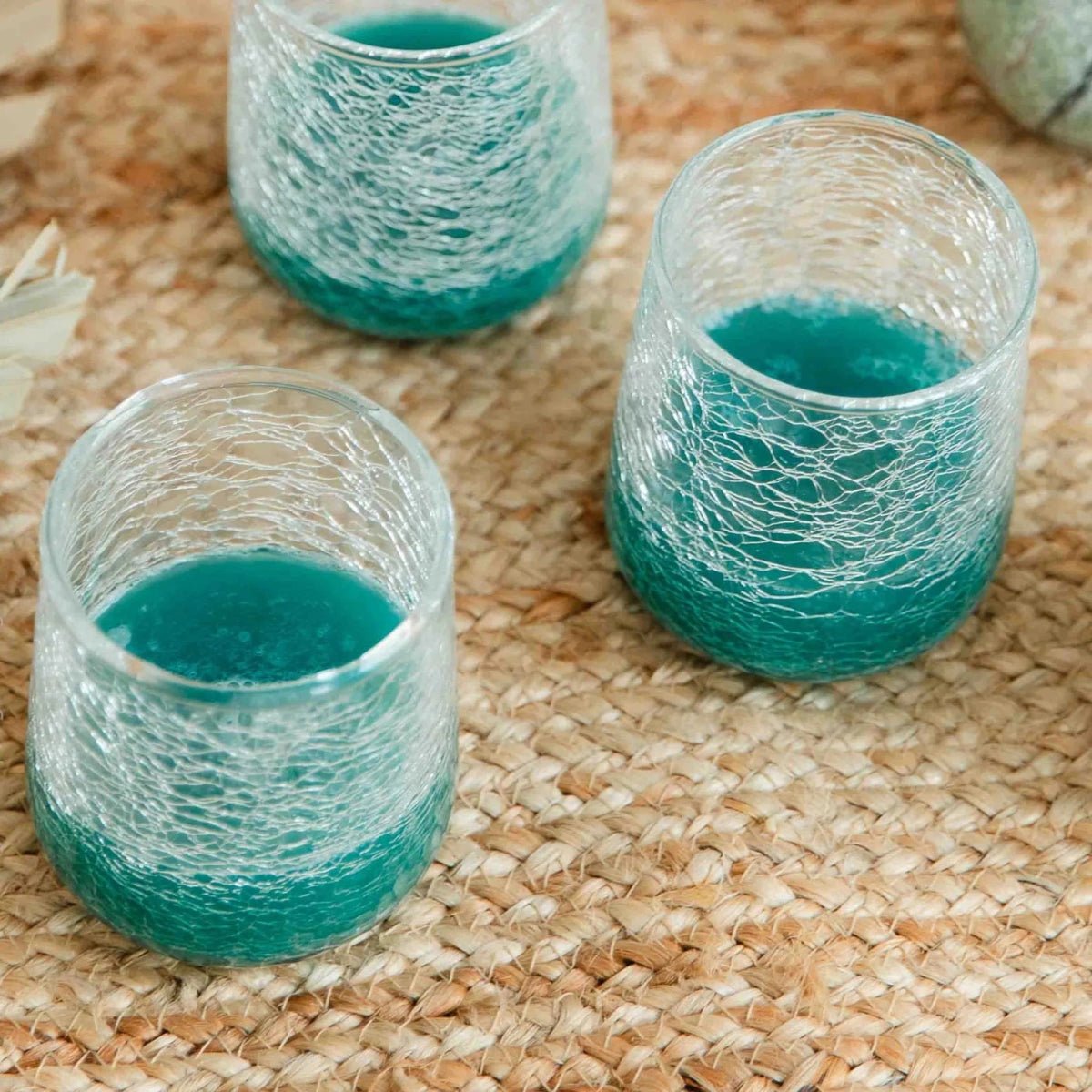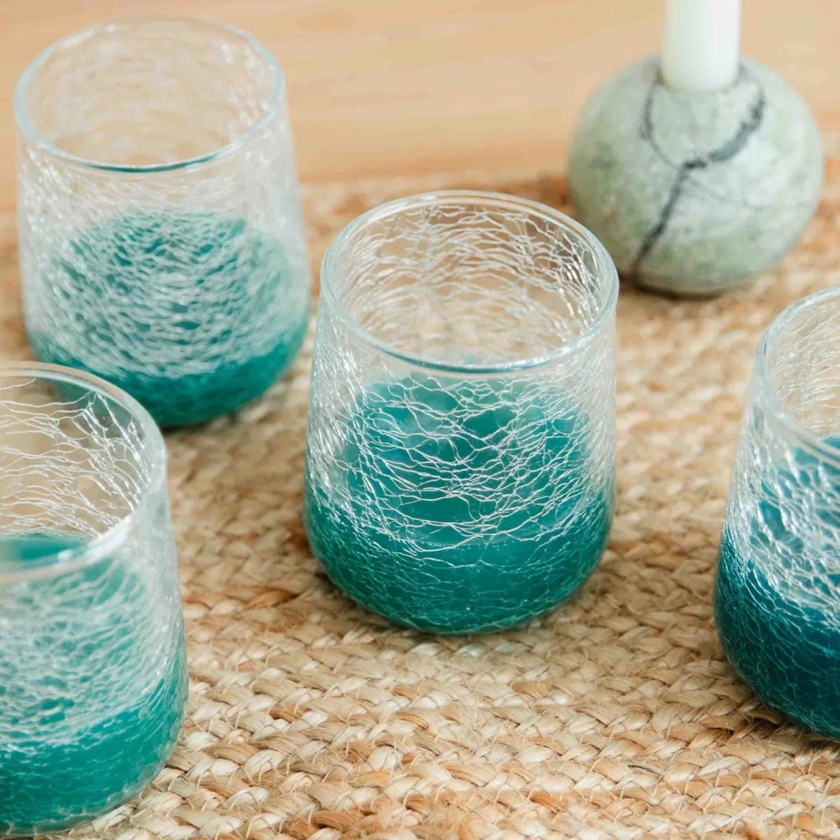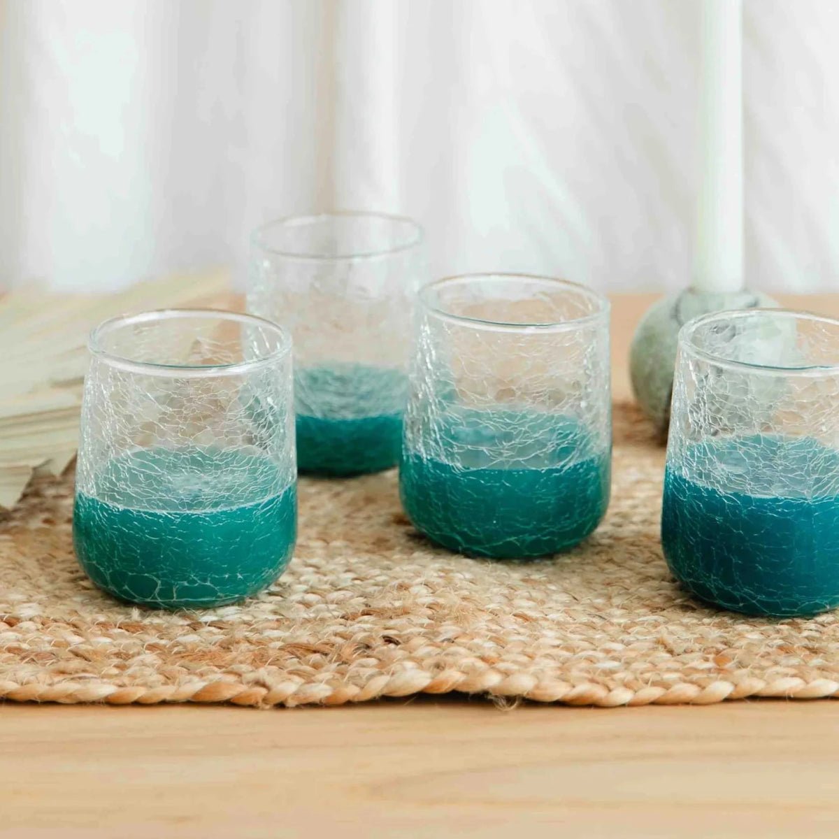Each goblet is individually mouth blown, creating the signature cracked glass finish that distinguishes these pieces from standard drinkware. The manufacturing process results in slight variations between glasses, making each piece unique while maintaining consistent quality and functionality across the set.