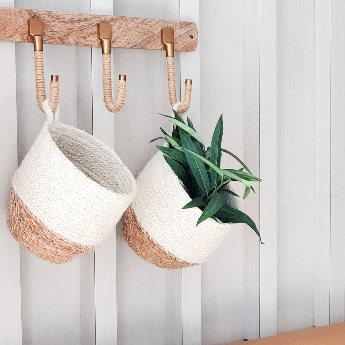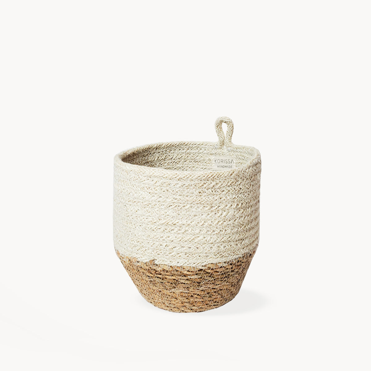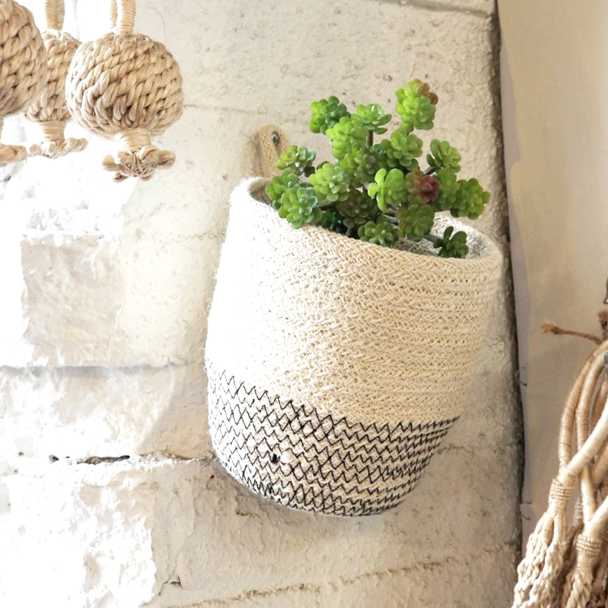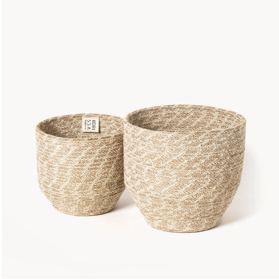 A set of four off-white round jute bowls with black stitching, displayed in different sizes.