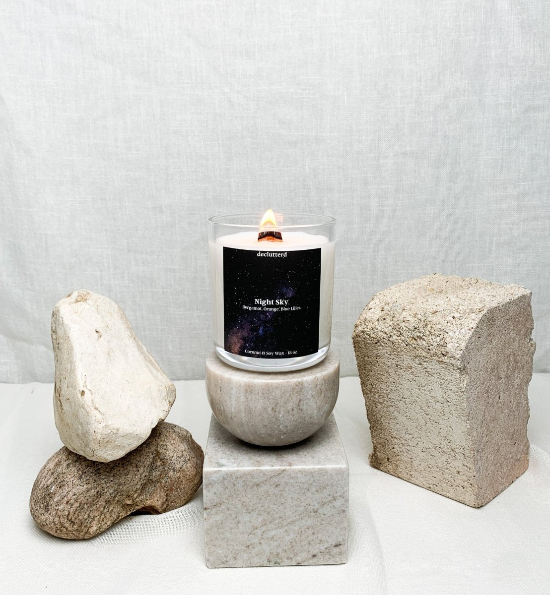 Opening with the bright notes of Bergamot and Orange, Night Sky sweeps you into starlit vistas. With a sparkle of cassis and the allure of deep sea water, this wooden wick candle captures the zest of lemon and the elegance of blue lilies and hyacinth. At the heart of this wood wick candle, floral elegance envelops you, reminiscent of a moonlit garden's soothing embrace.
