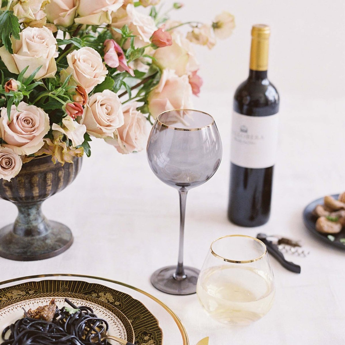 Whether you're hosting an intimate dinner party or elevating everyday moments, these charcoal wine goblets bring gallery-worthy style to your table. The sophisticated gray tones pair beautifully with both classic and contemporary table settings, while the gold rim adds a touch of refined luxury.