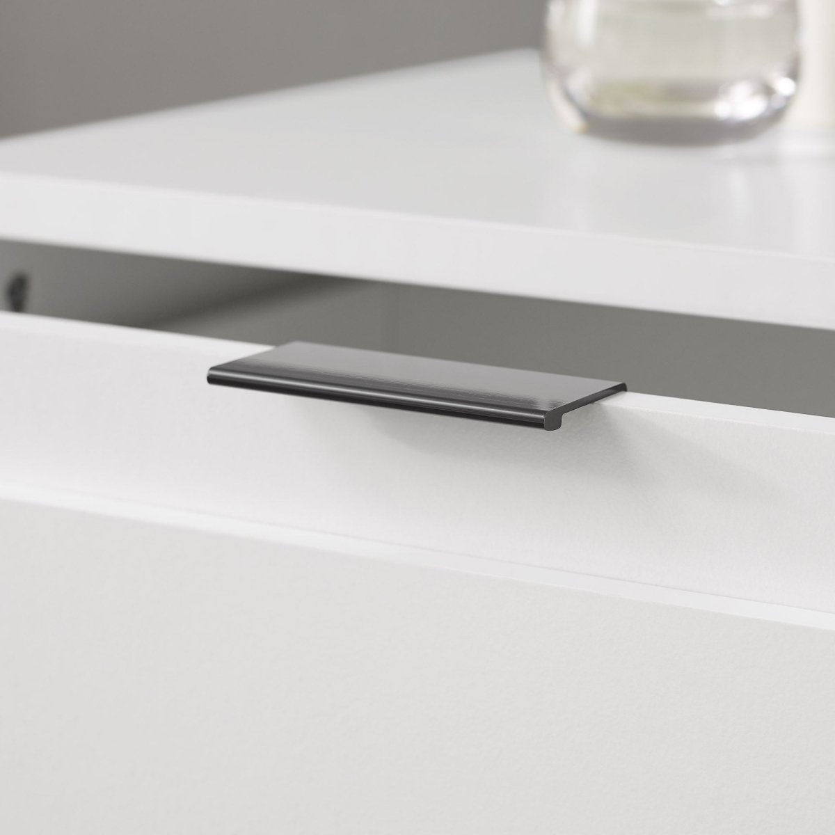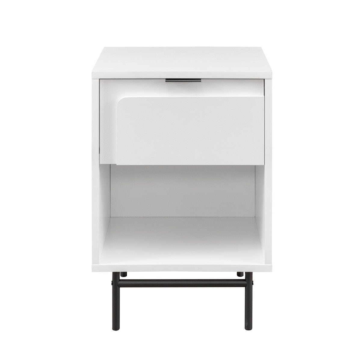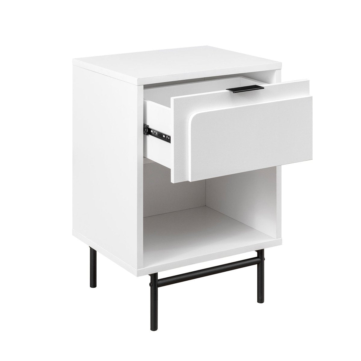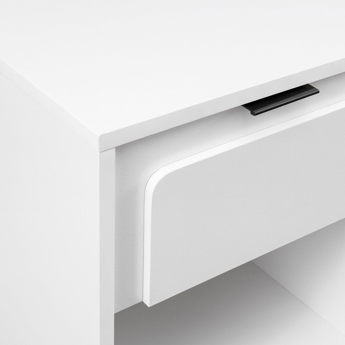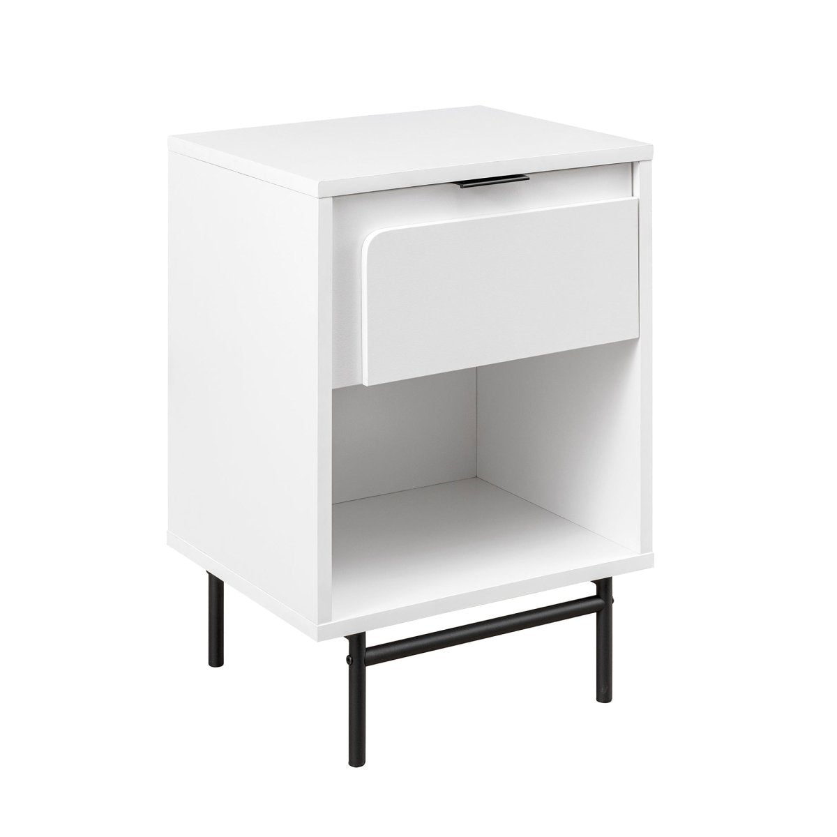 Regular price $87.00This 18-inch contemporary nightstand combines functional storage with modern design elements. The single drawer features distinctive 3D curved detailing on the drawer face, creating visual interest while maintaining a clean, boxy silhouette. Integrated metal drawer pulls eliminate the need for additional hardware, contributing to the streamlined aesthetic.