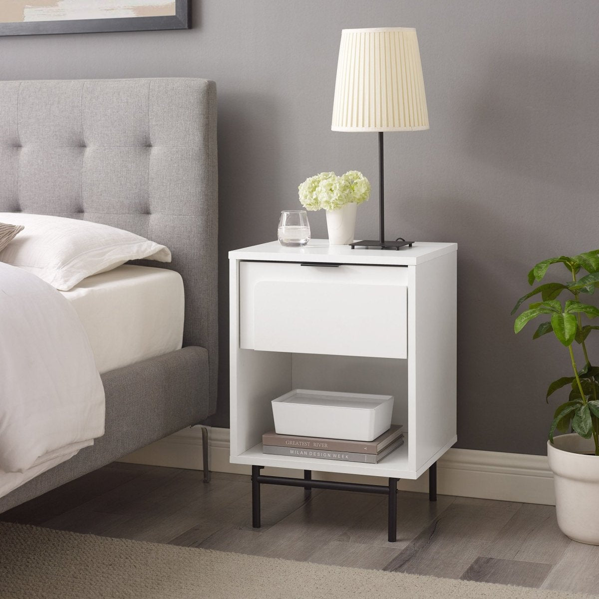 Built from warp-resistant MDF and durable laminate, this nightstand maintains its structure and appearance over time. Slim metal legs provide stable support while adding an urban, contemporary touch to the overall design. The combination of materials ensures durability at 20 pounds total weight, with dimensions of 26" H x 18" L x 15.75" W.