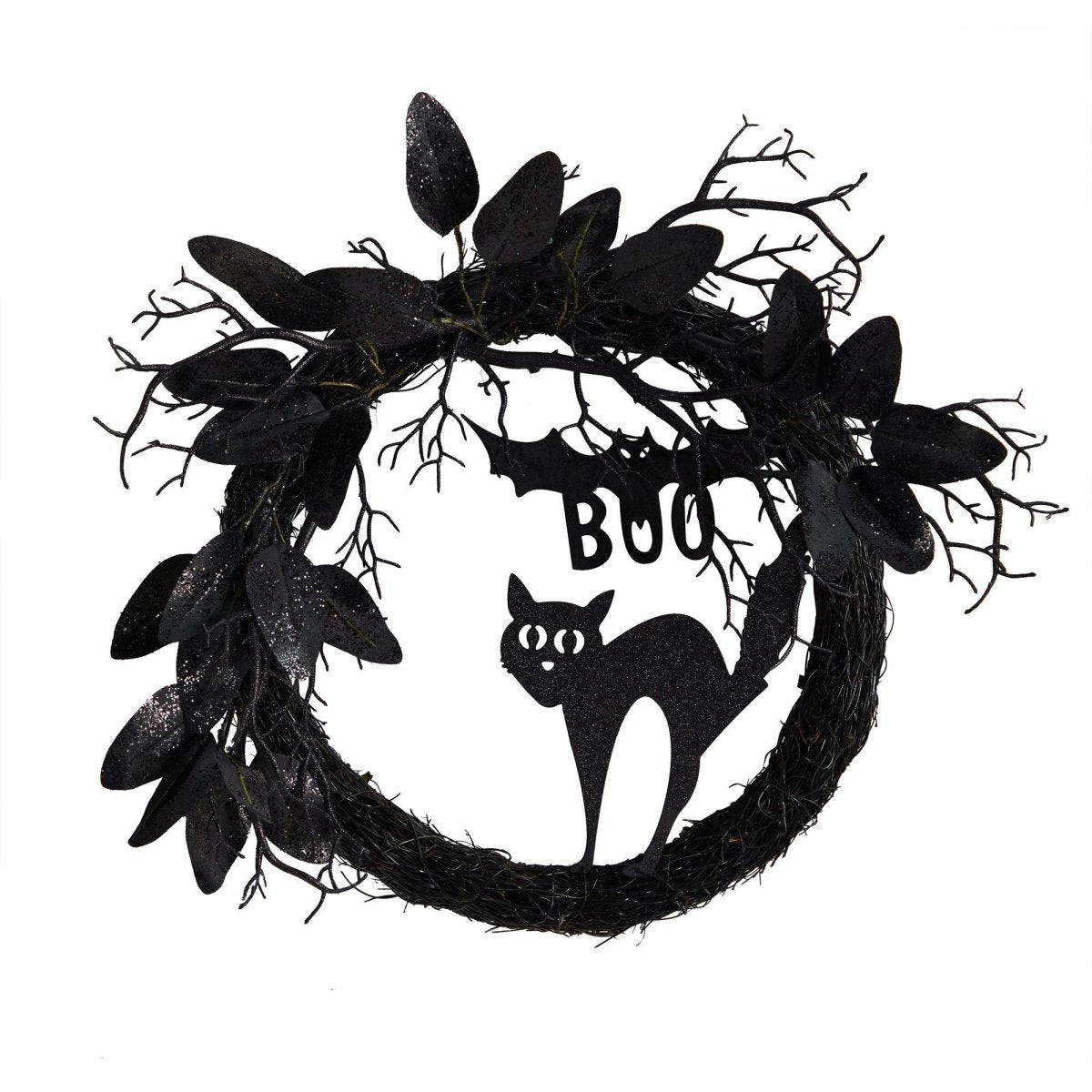 Designed with families in mind, this wreath appeals particularly to children who enjoy Halloween decorations. The playful combination of classic Halloween symbols—black cats and bats—creates a festive yet friendly appearance that welcomes trick-or-treaters without being overly frightening. The "Boo" text adds a whimsical touch that balances the traditional spooky elements.