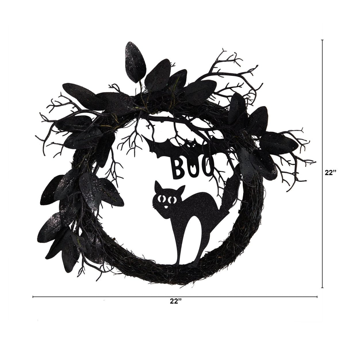 This 22-inch Halloween wreath brings spooky charm to your front door or wall with its black cat and bat design. The twig construction provides a rustic, natural base that contrasts beautifully with the bold black silhouettes and "Boo" lettering, creating an eye-catching Halloween display that captures the spirit of the season.