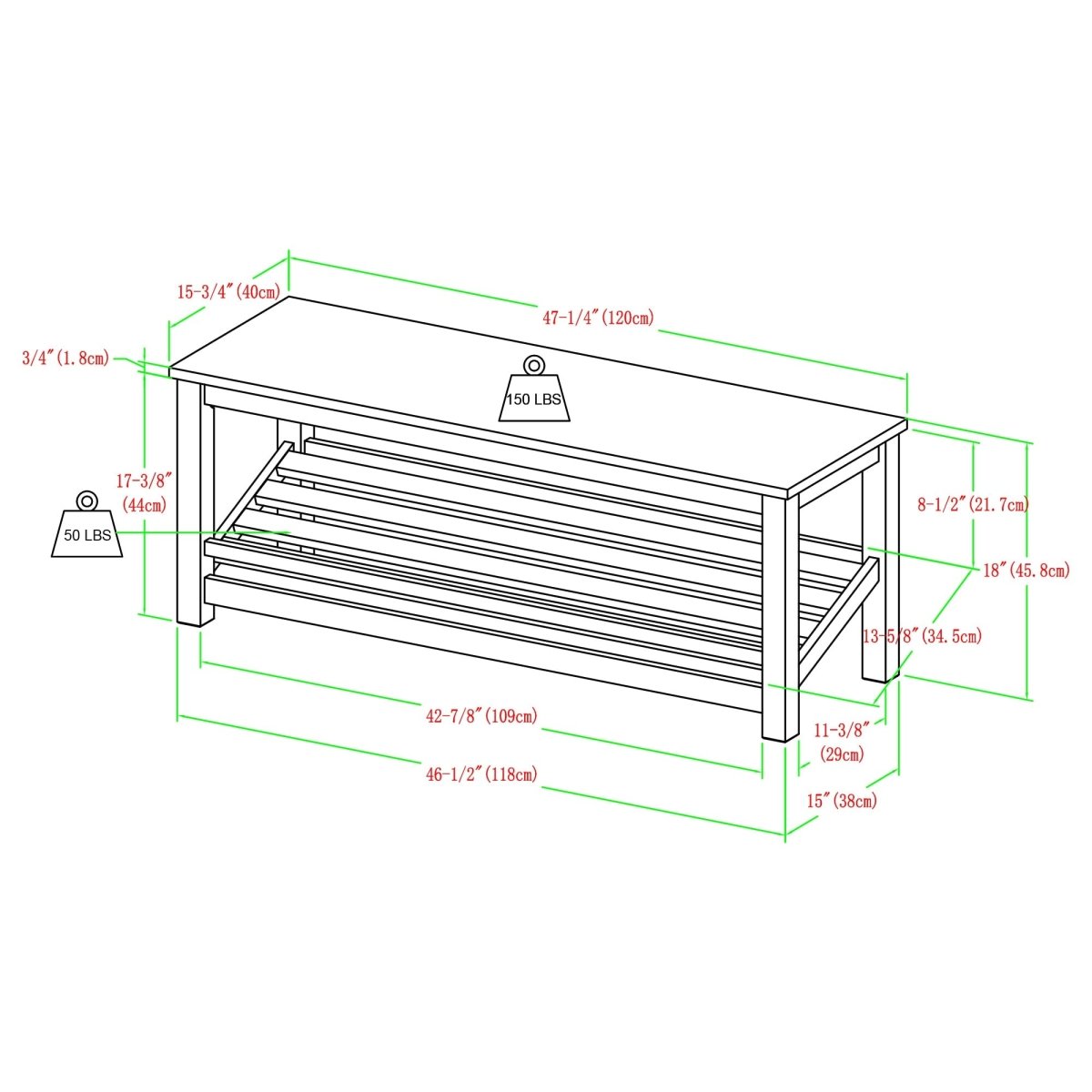 This 48-inch entry bench combines seating and storage in a compact design built for everyday use. The angled lower shelf accommodates multiple pairs of shoes while a horizontal wood bar keeps footwear organized and in place. Measuring 18" H x 48" L x 16" W, the bench fits comfortably in entryways, mudrooms, and hallways without overwhelming smaller spaces.