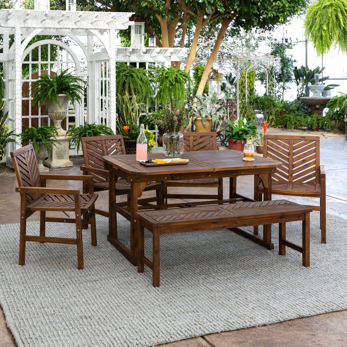 Rain or shine you’ll want to gather around this good-looking, sturdy 6-piece outdoor dining set. The four comfortable patio chairs and bench feature a chevron wood design for a fun and modern spin on the classic outdoor dining set. The patio table includes a butterfly extension and can accommodate an umbrella in the center hole so you can stay out of the sun if you'd like to. This modern backyard living set will have you feeling fancy and fresh even when someone lets the barbeque dinner cook a little too long.