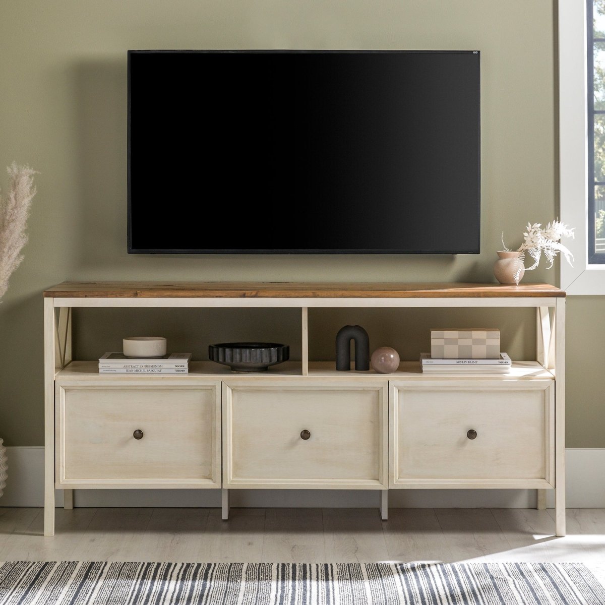 Implement a sense of family in your home with signs of “Gather” and “Live, Laugh, Love” displayed on this farmhouse TV stand. The attractive side V accents add an extra rustic touch to the two-tone design. Place your TV up to 65 inches on the top and host the family for watch parties. They will love the three, easy-open, large drawers which hold games, blankets, and movies. The open display space provides the perfect spot for a sound bar, so everyone can enjoy the gatherings in your living room.