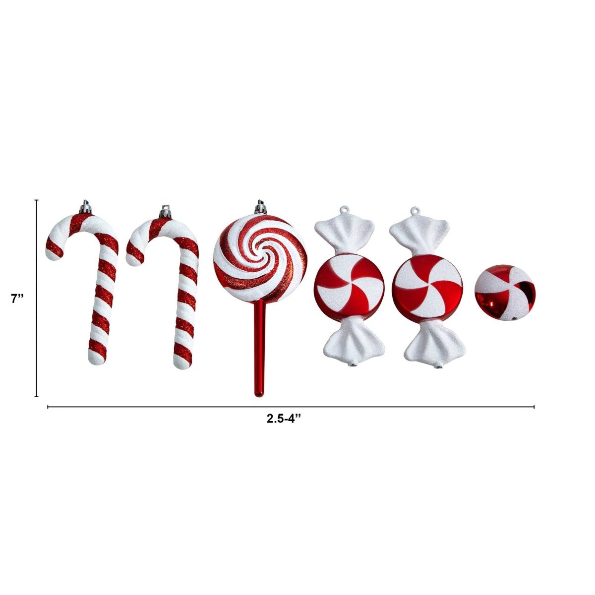The dimensions vary across the collection to match realistic candy proportions. Width ranges from 2.5 to 4 inches, with a consistent 7-inch height and 1 to 1.5-inch depth. This size variation adds natural visual flow when clustered together or distributed throughout your tree branches.
