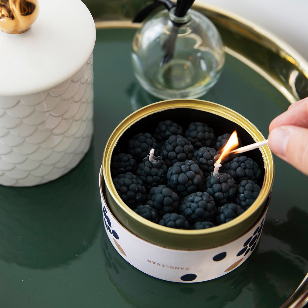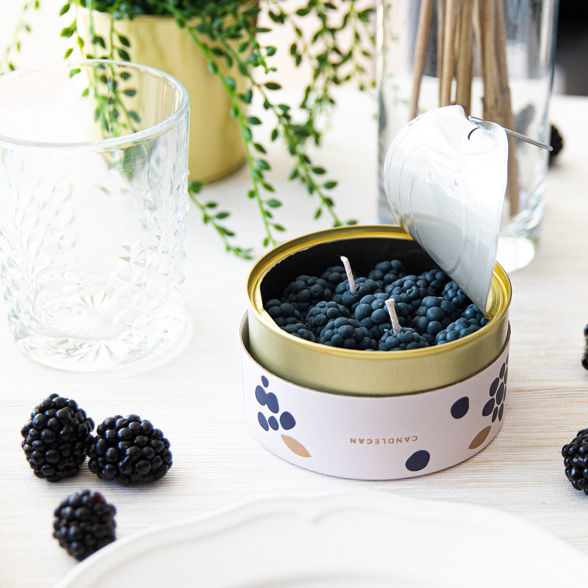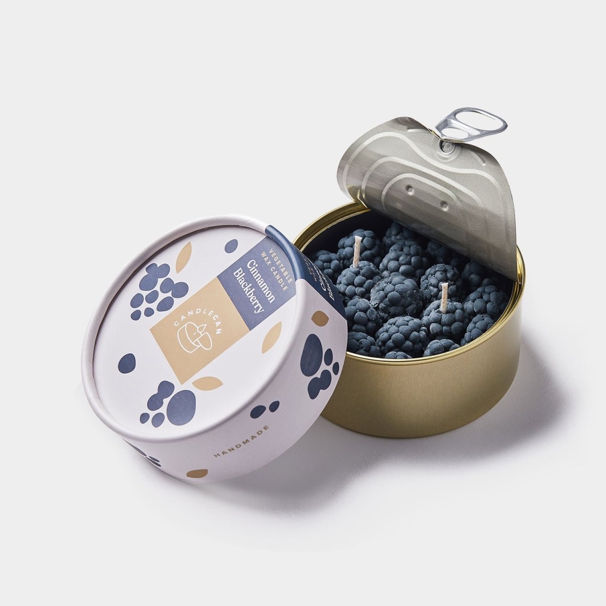 Blackberry-shaped, cinnamon-scented. A texture so inviting to the touch that you almost have to light it to keep from rubbing it all the time. Pull the tab to get that ever-so-satisfying feeling that comes with removing the lid.
