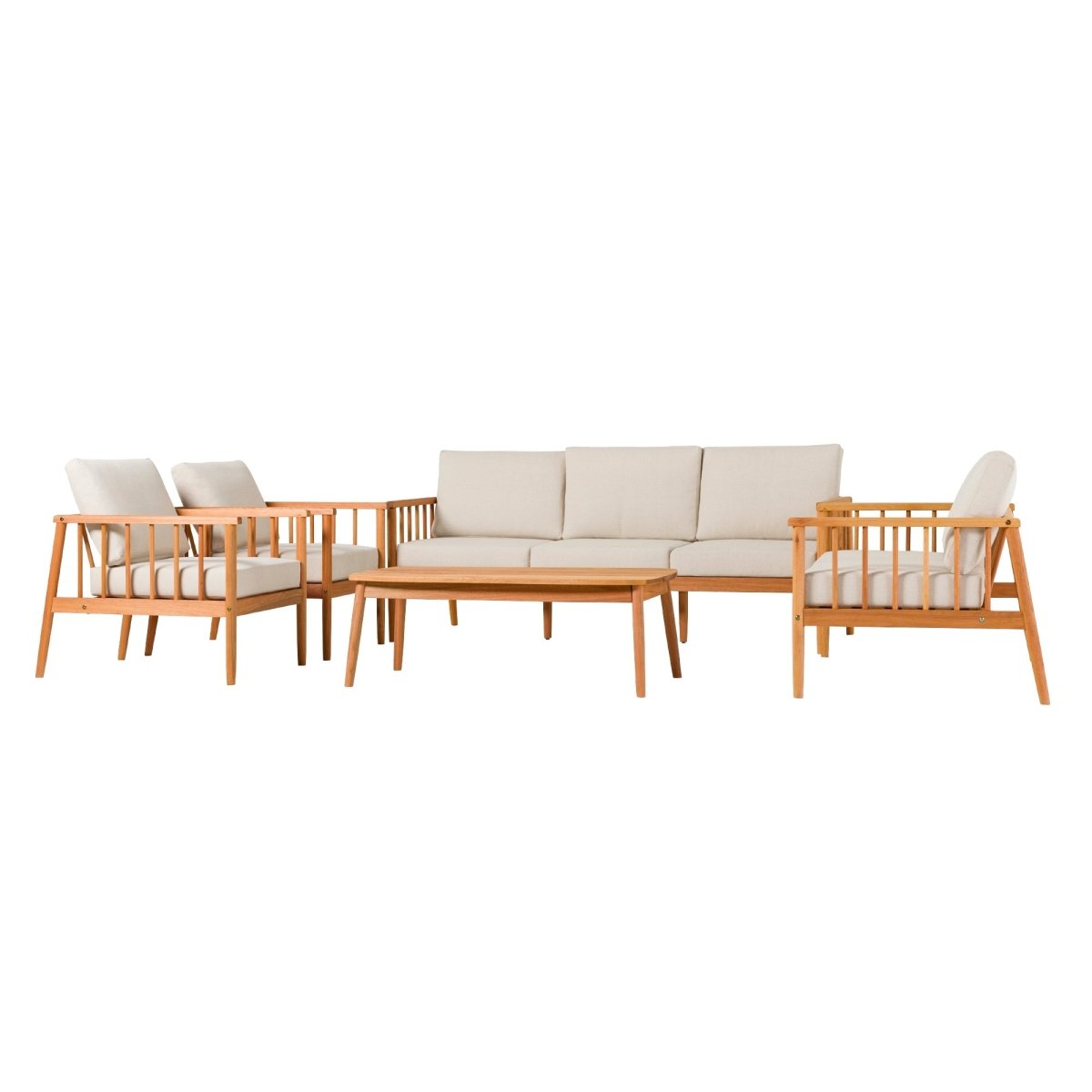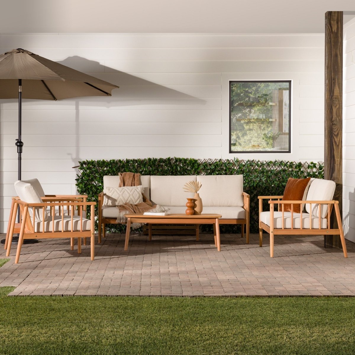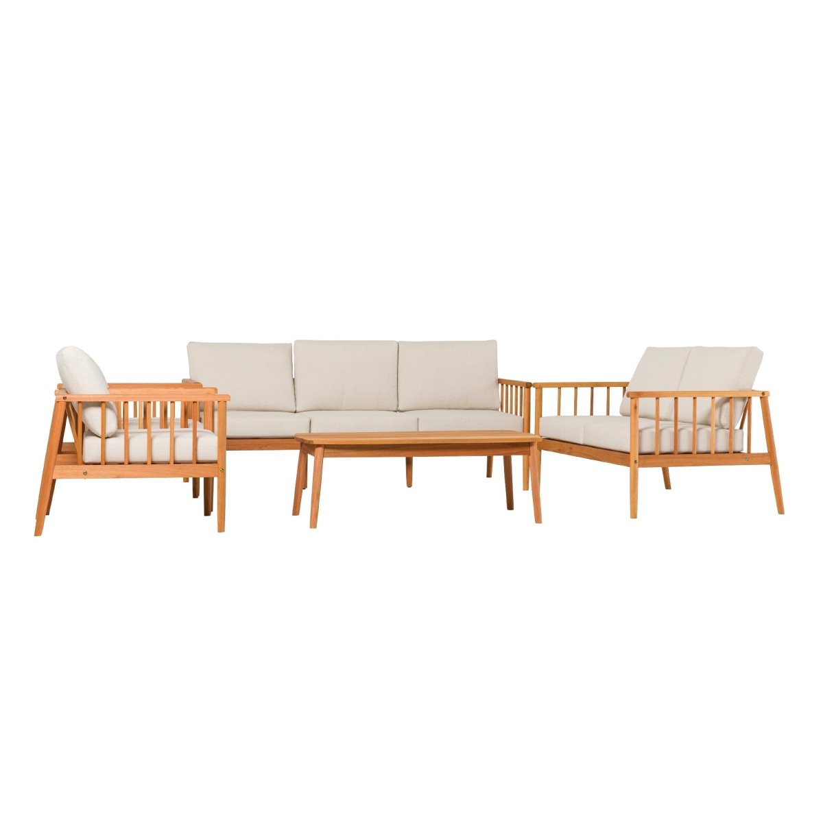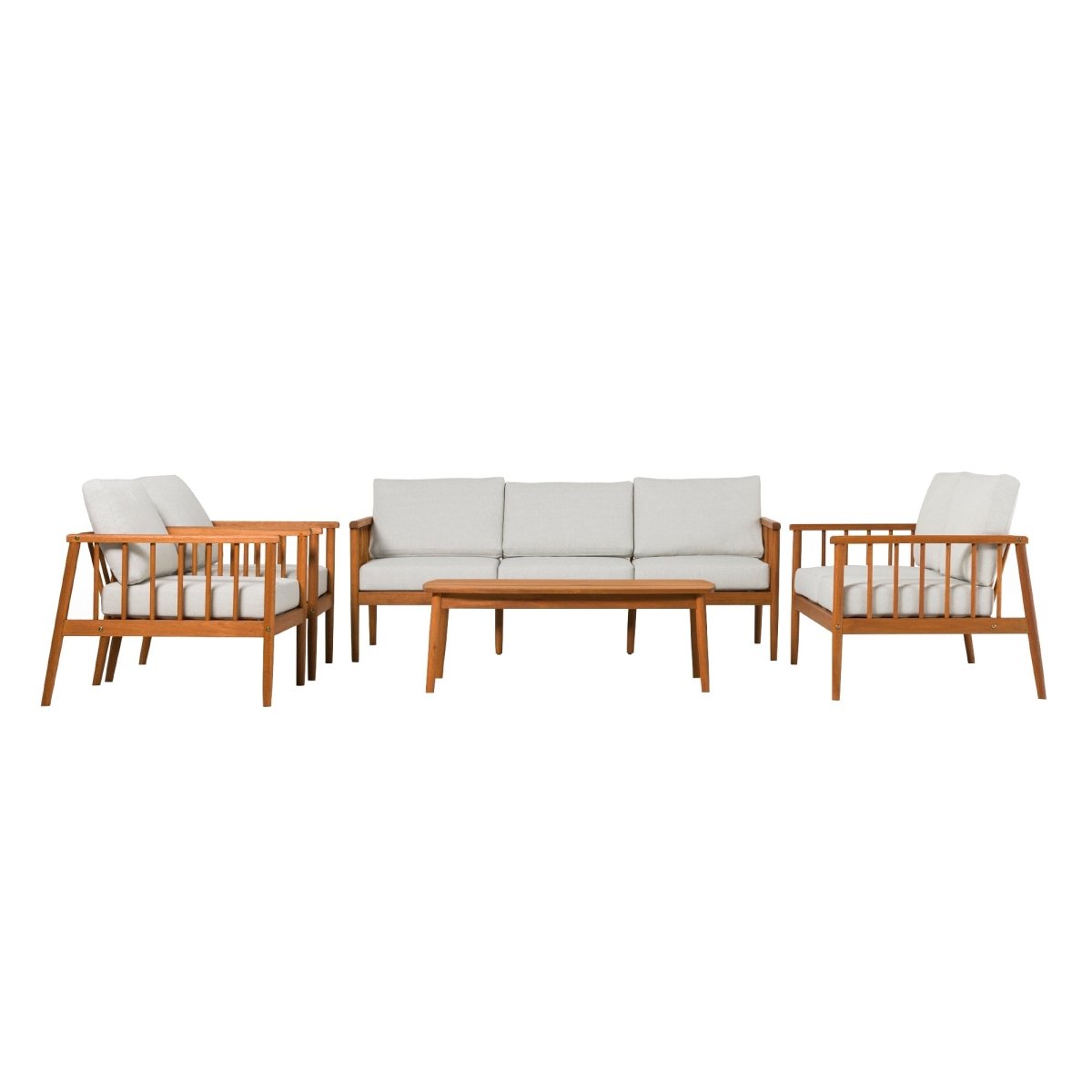 Regular price $1,257.00Lay back, lounge, and look forward to your next backyard bash with this patio set on display and ready to entertain. Low-key comfort and high-key style effortlessly unite with this matching set’s spindle sides and plush cushions. Configure each piece however you like to host summer soirees or intimate get-togethers with friends and family—with enough room for everyone! The perfect surface for smore’s assembly, game night, or seasonal cocktails, the solid wood coffee table is the cherry on top of this essential entertainment hub. Mindfully crafted with solid eucalyptus wood, this set is sustainable, stylish, and moisture resistant.
