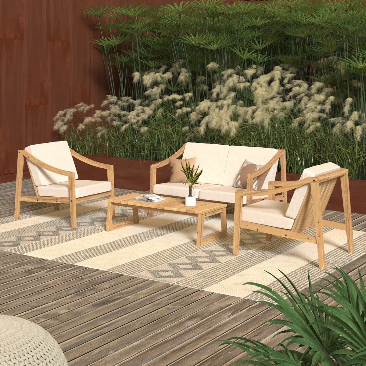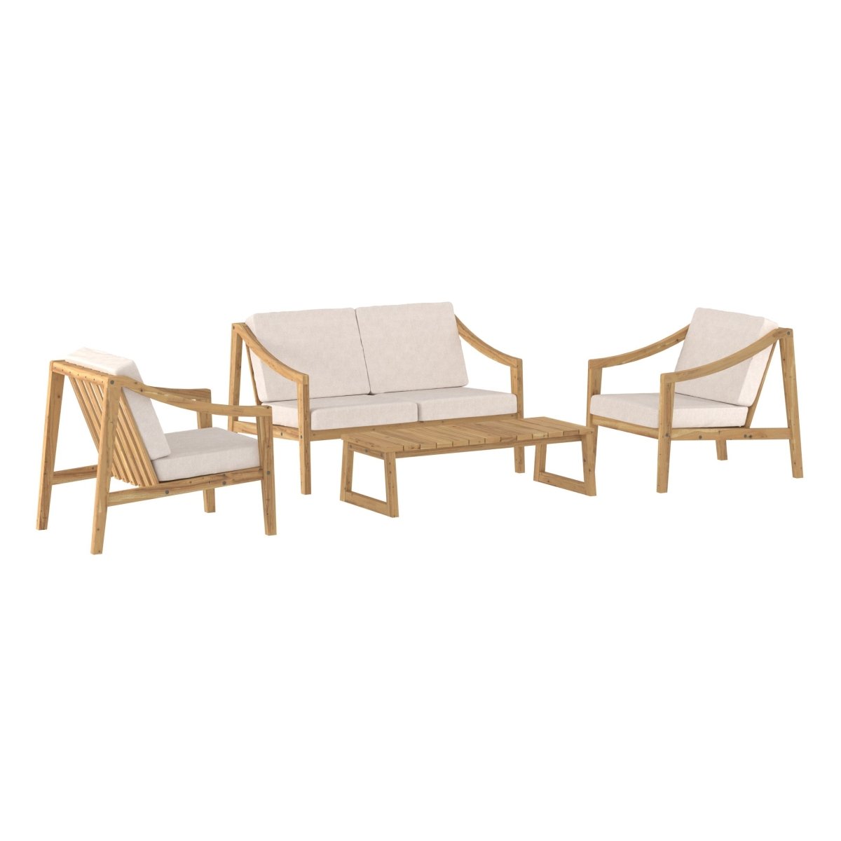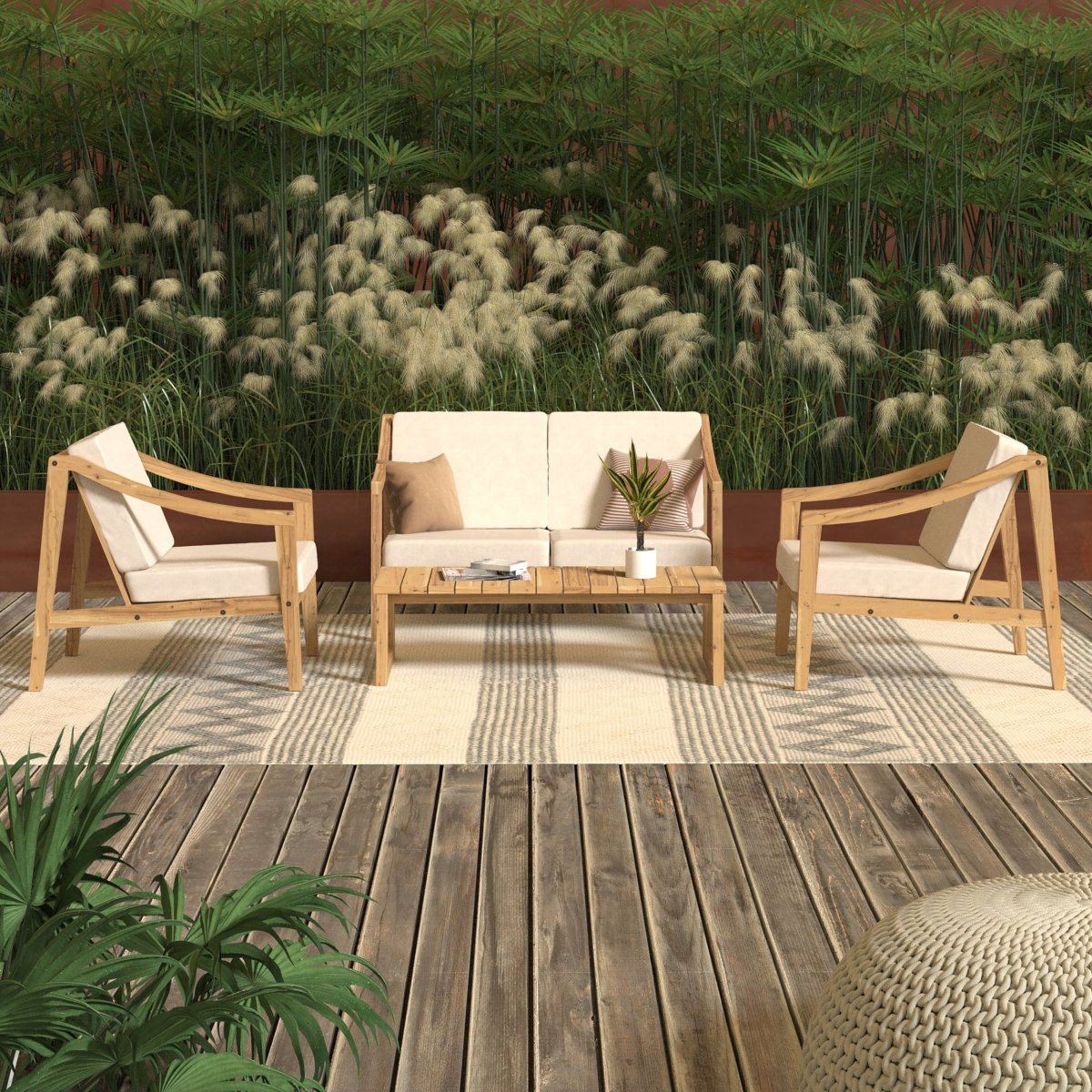 Sit in the lap of luxury with this cushioned, solid wood chat set. The loveseat and chairs’ acacia wood frames and sweeping arm rests lend a super luxe look, and the slatted top of the coffee table can support up to 100 pounds of drinks or decor. Sit and sip your favorite afternoon pick-me-up atop the soft, cushioned seats and backrests, and rest your cocktails, mocktails, or charcuterie creations atop the coffee table. Pair these four pieces with the matching side table for a set that’s sure to offer backyard bliss and plenty of room for you and your guests.