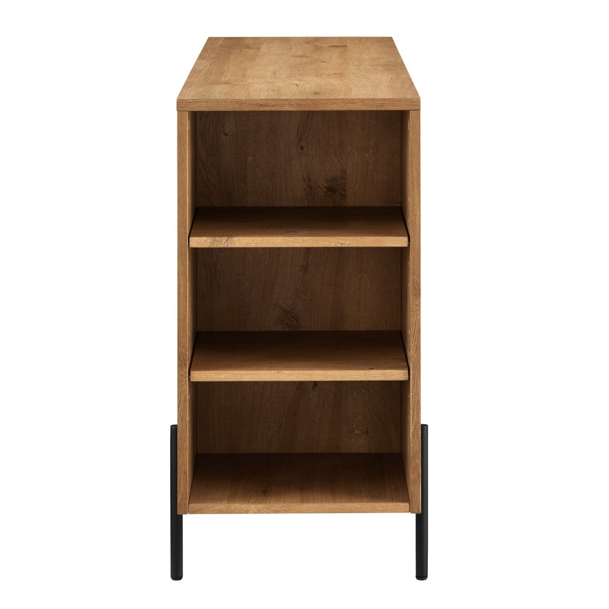 Revamp your home with this Modern 6-Shelf Storage Entry Table. The front and sides feature two shelves each, offering plenty of space to display books, travel souvenirs, or eclectic décor. Each shelf is adjustable, allowing you to reposition them as you see fit for your belongings. The table's slim yet sturdy metal H-legs appear as if they're mounted to the outside of the frame, adding an urban influence to your contemporary living room, entryway, or hallway.