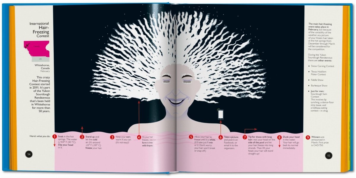 Whether it’s flinging frozen rats or parading in holly evergreens, racing snails or carrying wives, human beings have long displayed their creativity in wild, odd, and sometimes just wonderful rituals and competitions. To show what lengths we’ll go to uphold our eccentric customs, British American graphic designer Nigel Holmes channels his belief in the power of hilarity to bring together a bewilderingly funny tour around the globe in search of incredible events, all dryly explained with brilliant infographics.