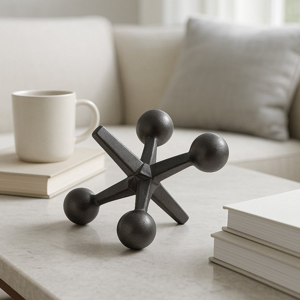 This geometric jack sculpture features a smooth, powder-coated finish that resists fingerprints and maintains its sleek appearance. The aluminum construction keeps the piece lightweight at just 1.13 lbs, making it easy to reposition while remaining stable on flat surfaces. The six-pointed jack design creates visual interest from multiple angles, casting subtle shadows that change throughout the day.