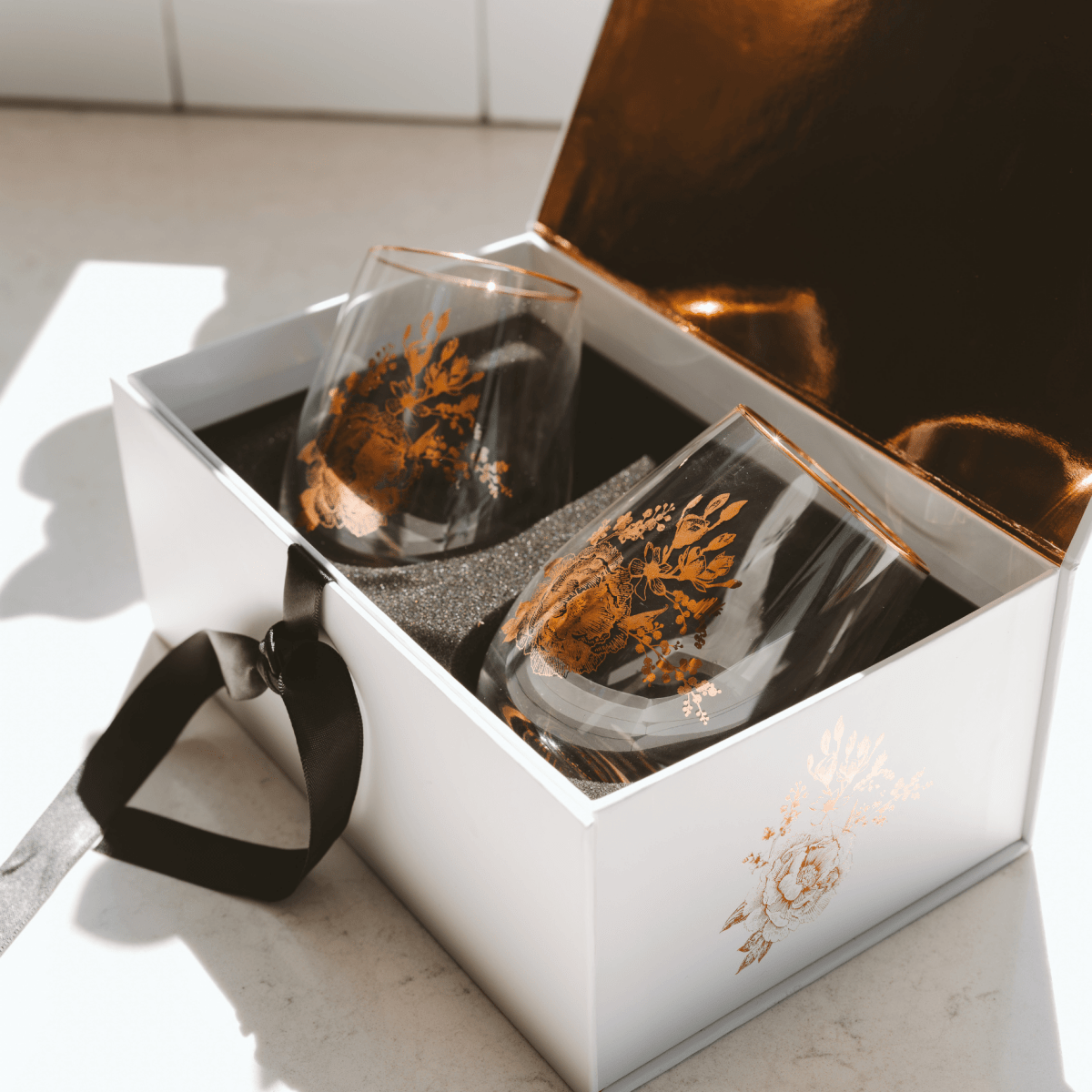 This boxed set of 2 stemless wine glasses combines classic Delft design with modern functionality. Each 15.5oz glass features delicate gold foil floral patterns that bring timeless style to any table setting.