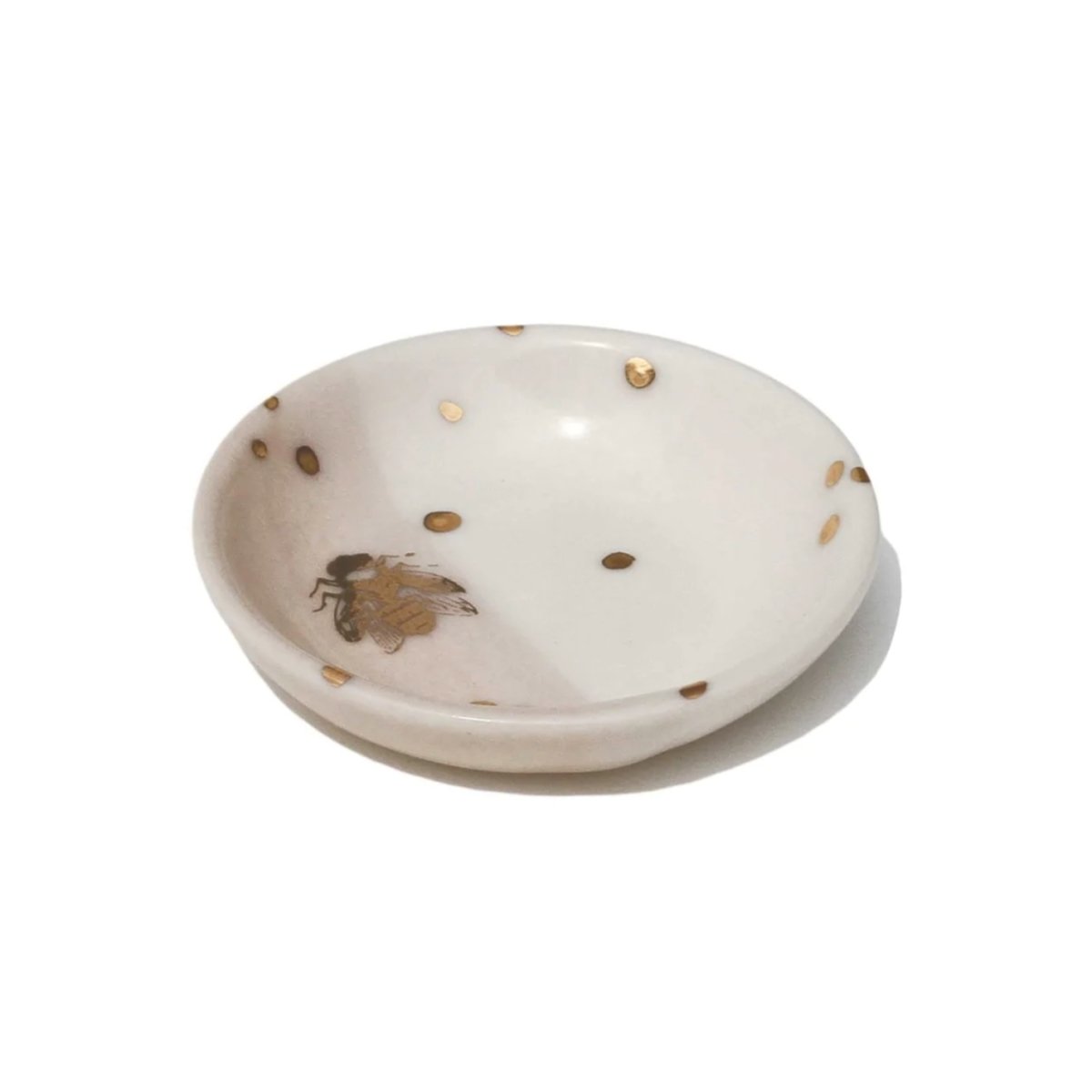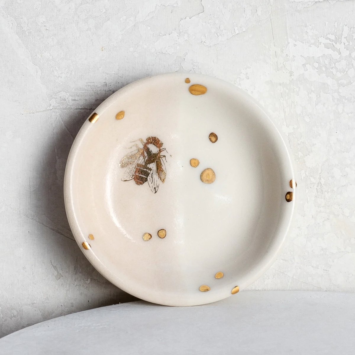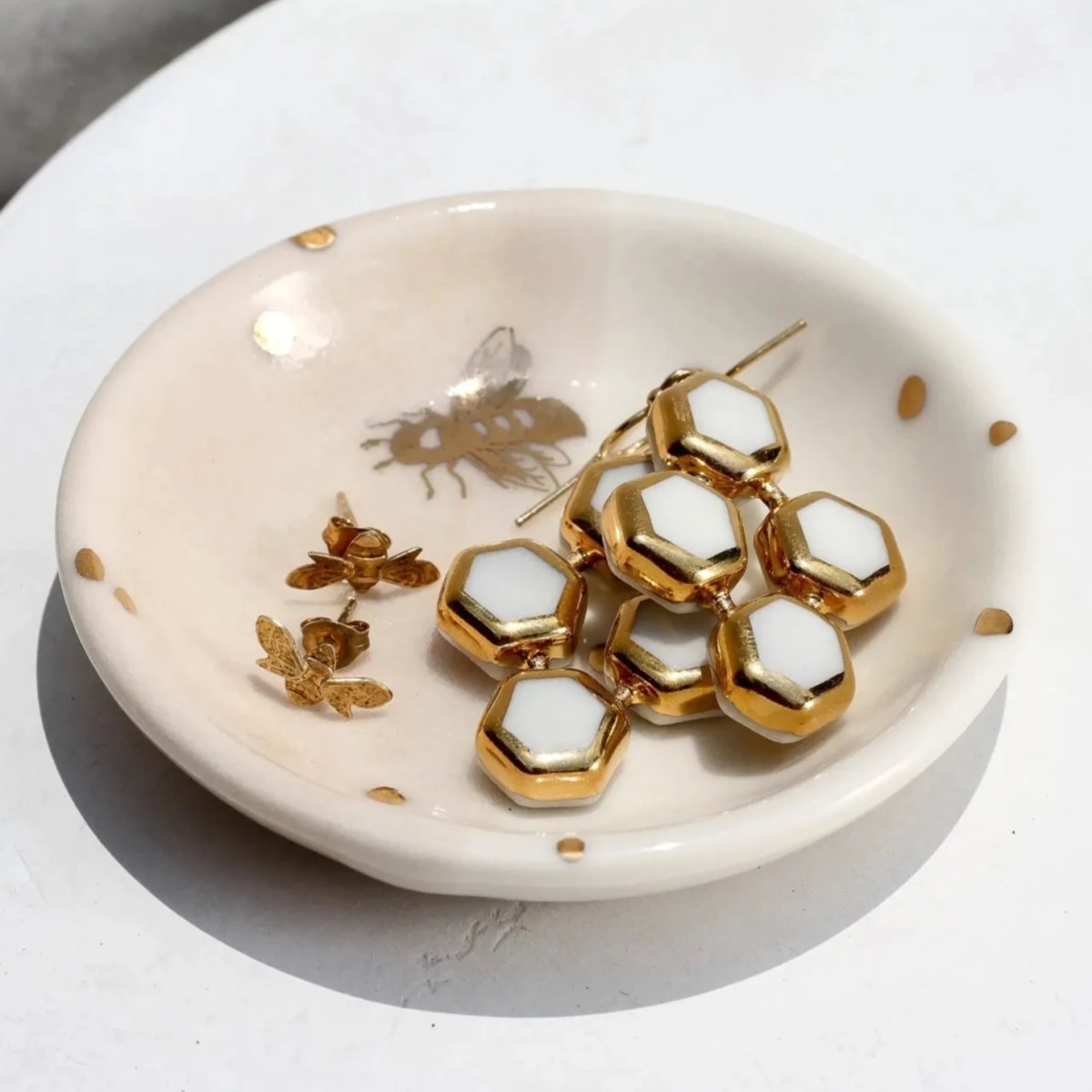 Great for holding jewelry, candles, tea bags— you name it! Each two toned honey beige and white glazed porcelain Drops of Honey bee trinket dish is 3” wide and features 1 gold bee with “drops” of 22k gold luster.