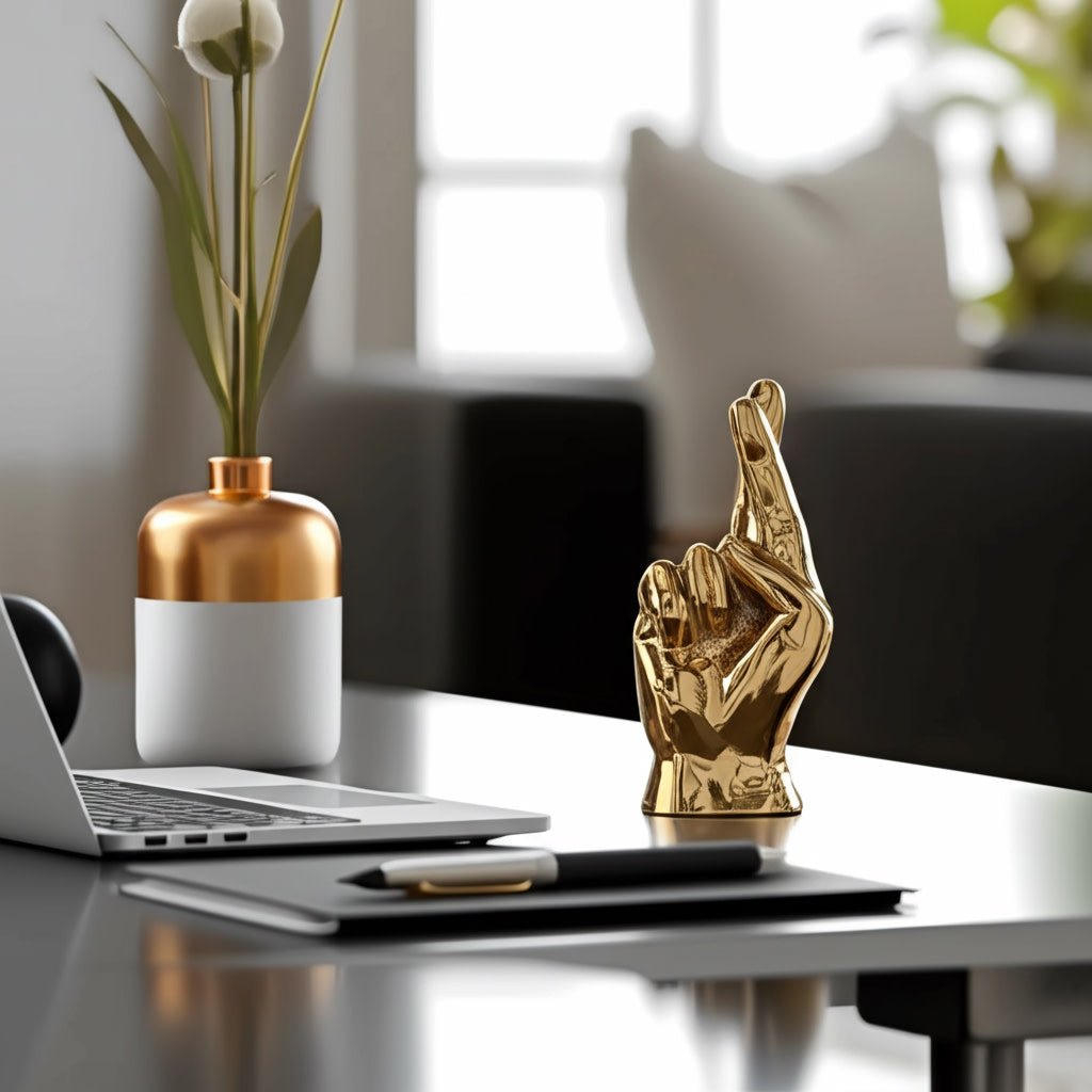Aerial view of crossed fingers hand sculpture in gold against white background