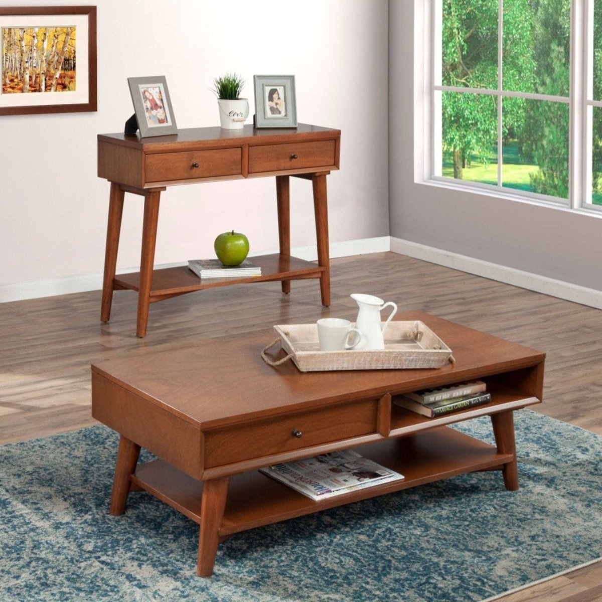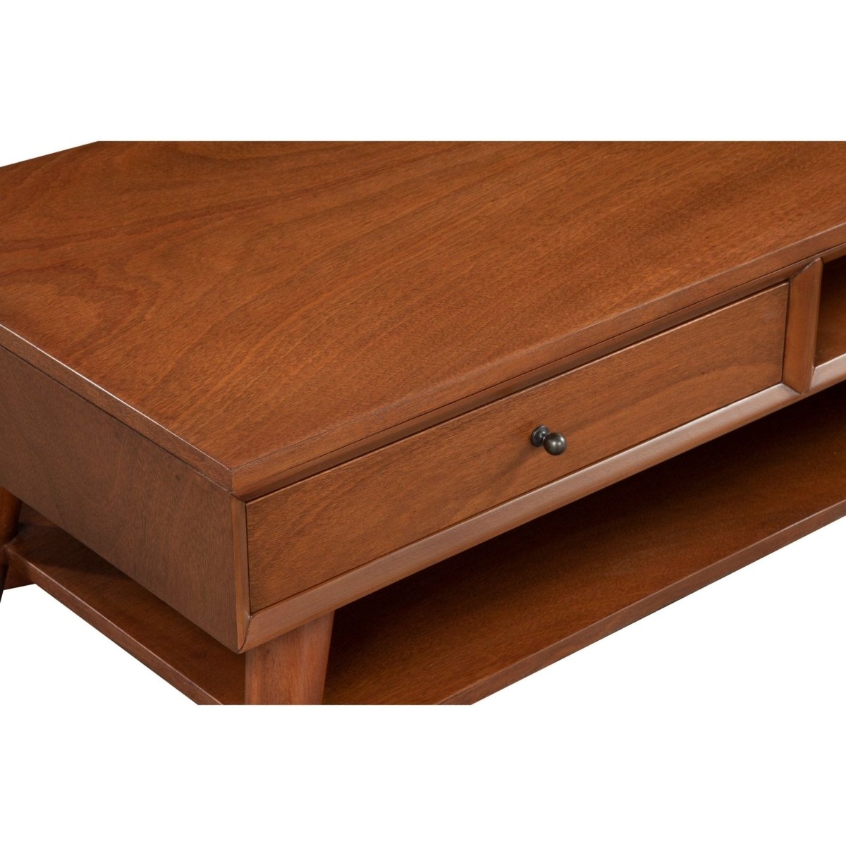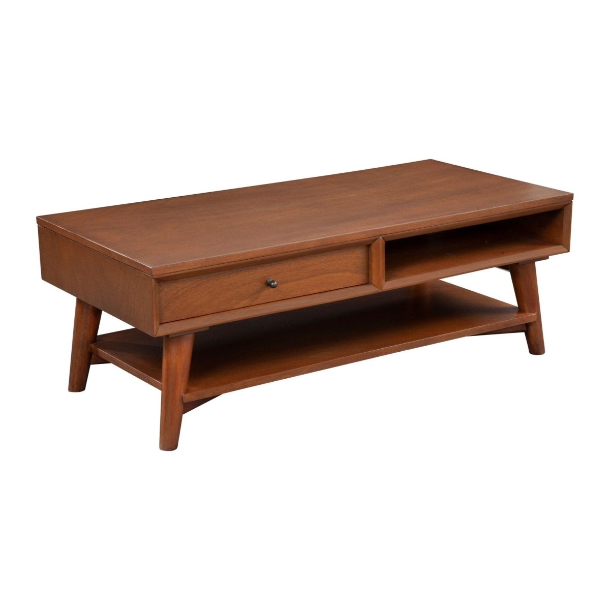 Lend your living room layout a little Mid-Century modern flair with this clean-lined piece. Found atop four splayed legs, the Flynn cocktail table is crafted from Mahogany wood solids and Okume veneer. The felt lined drawer offers out-of-sight storage for odds and ends while the rectangular top provides a place to spread out snacks, magazines, and more. The drawer is on a 2-way slide allowing easy access from either side of the table and there is an open shelf for additional storage. The acorn (brown) finish is versatile enough to complement most color palettes.