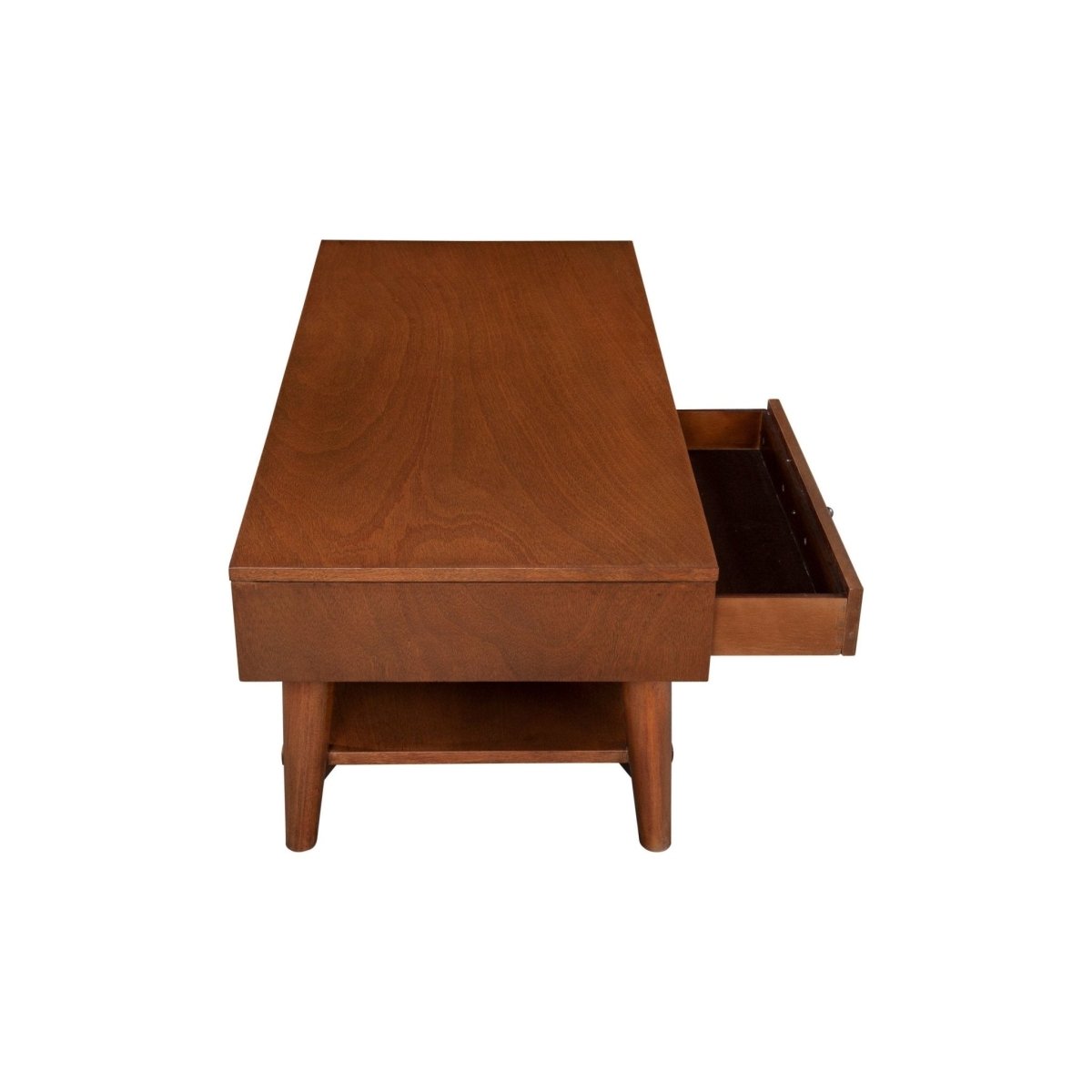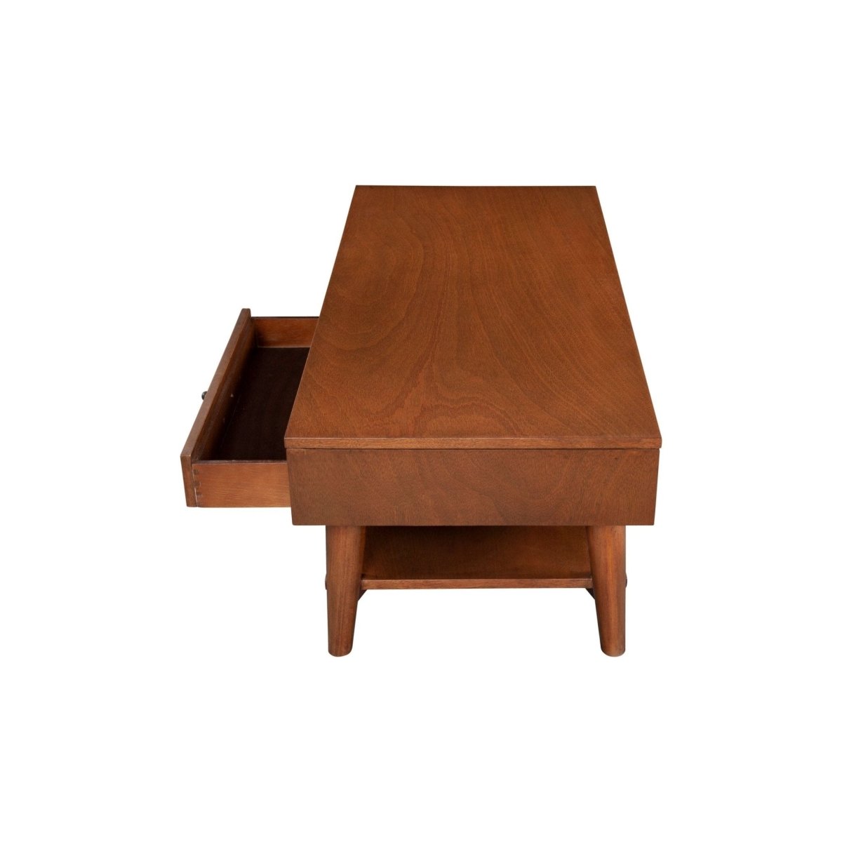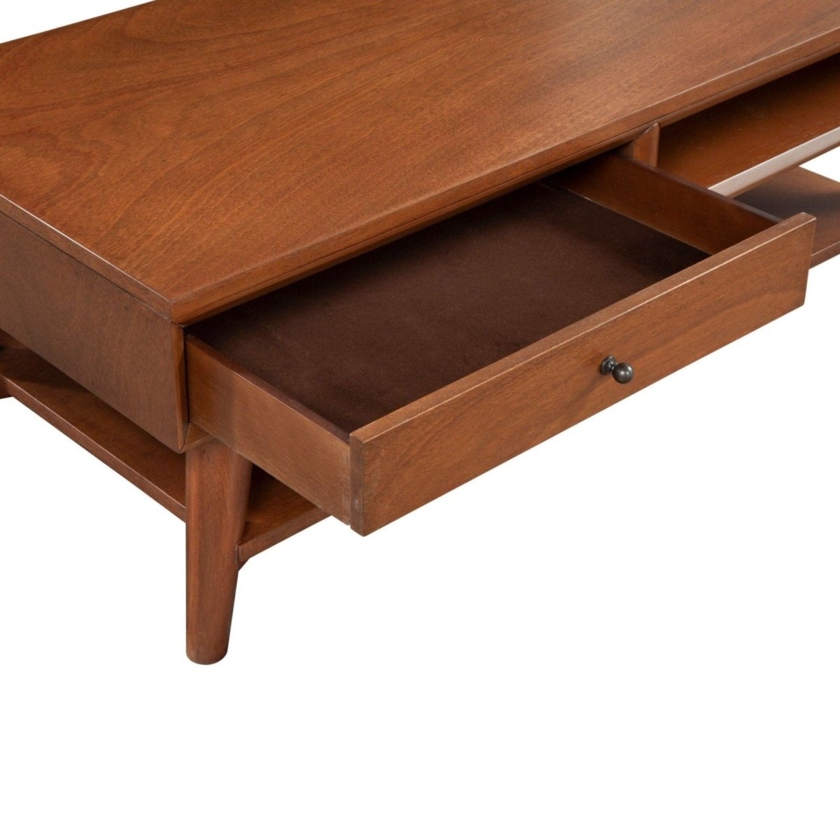 Lend your living room layout a little Mid-Century modern flair with this clean-lined piece. Found atop four splayed legs, the Flynn cocktail table is crafted from Mahogany wood solids and Okume veneer. The felt lined drawer offers out-of-sight storage for odds and ends while the rectangular top provides a place to spread out snacks, magazines, and more. The drawer is on a 2-way slide allowing easy access from either side of the table and there is an open shelf for additional storage. The acorn (brown) finish is versatile enough to complement most color palettes.