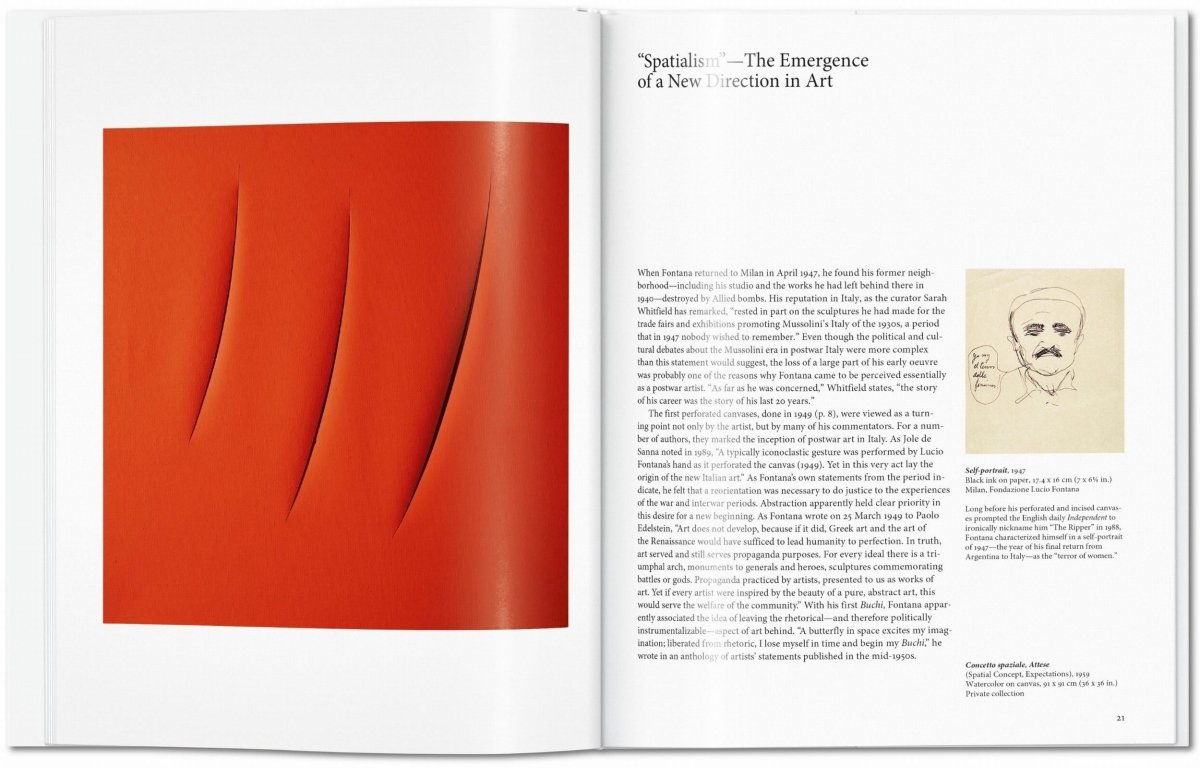 Italian artist Lucio Fontana literally tore the art establishment apart. Trained as a sculptor, he combined form and color in radical spatial gestures, most famously his slashed canvases of the 1950s and ’60s. Regarded as the father of midcentury Spatialism, his provocative practice channeled postwar innovation in a pioneering synthesis of art, technology, and science.