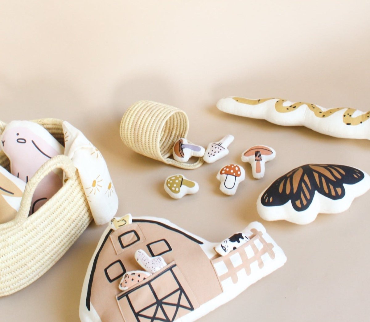 Made entirely from natural canvas, this playset offers a soft, durable alternative to plastic toys. The hand screen-printing process ensures each farmhouse has distinct character, while the plush animals are crafted with attention to detail that only handmade toys can provide.