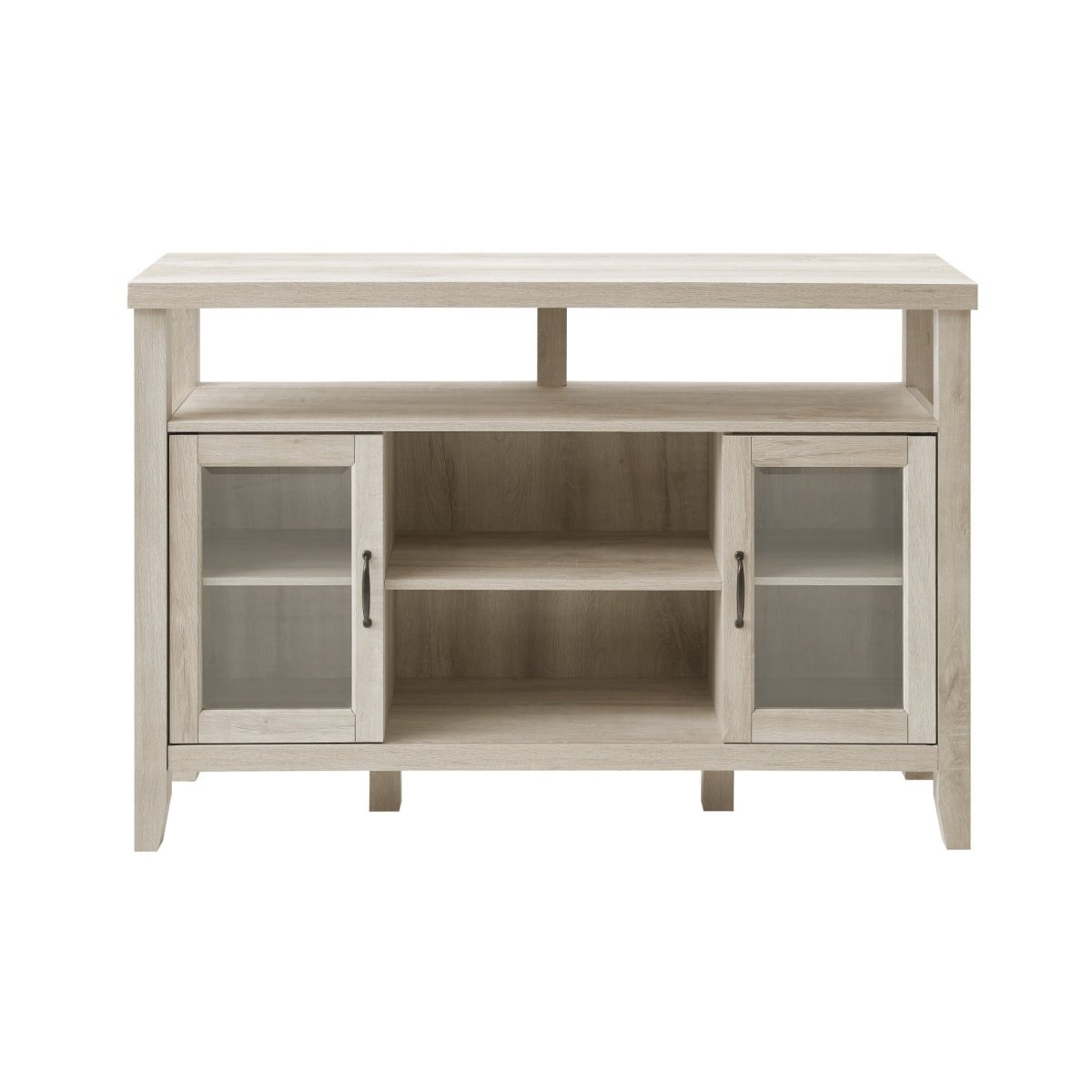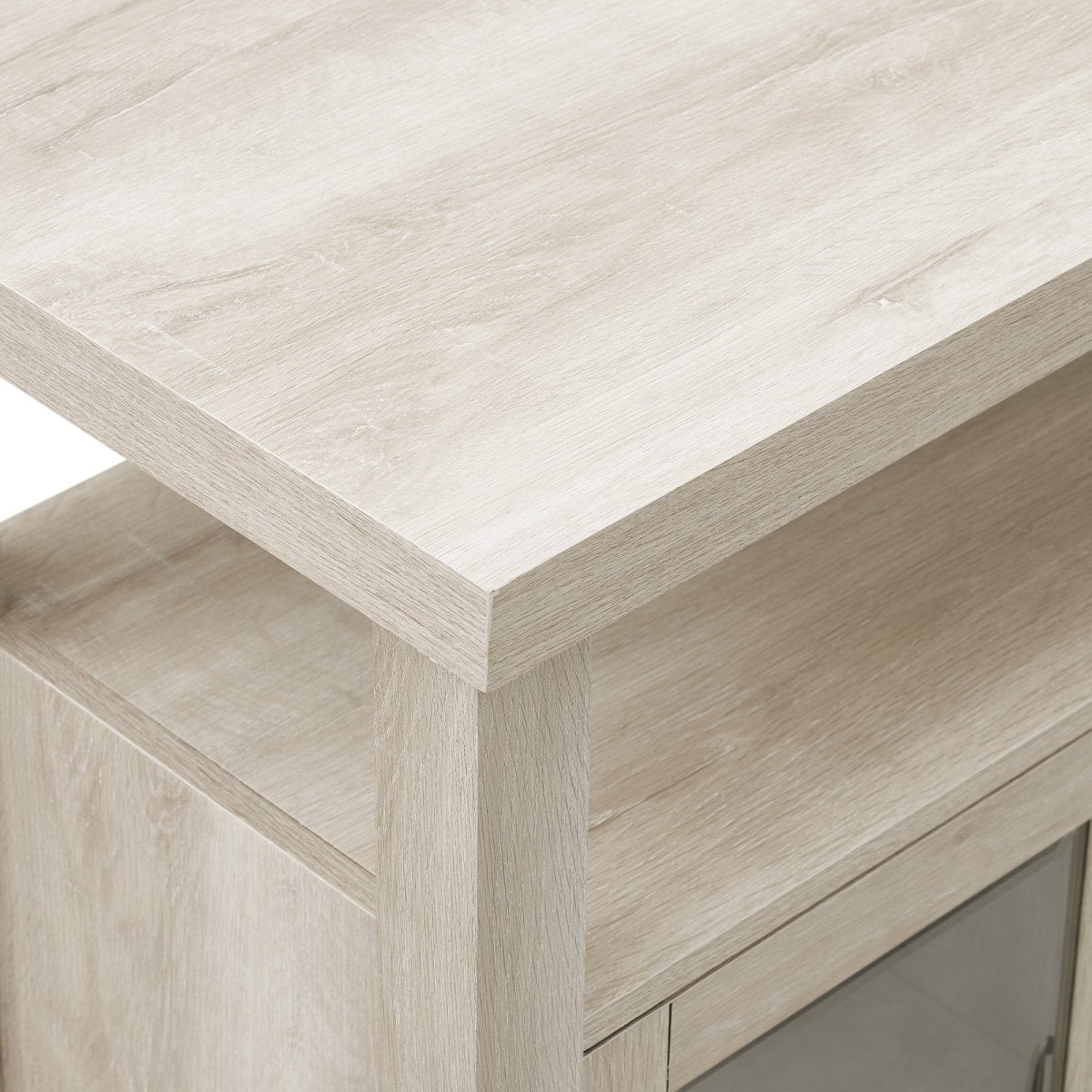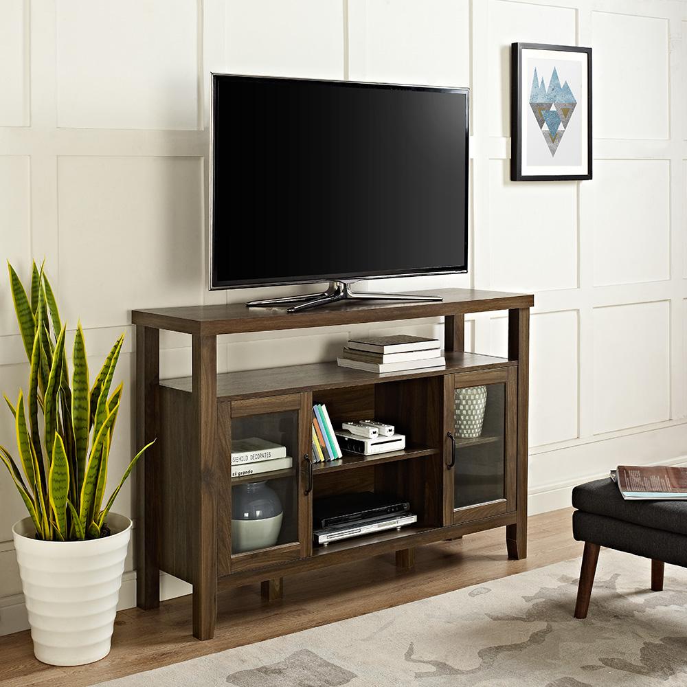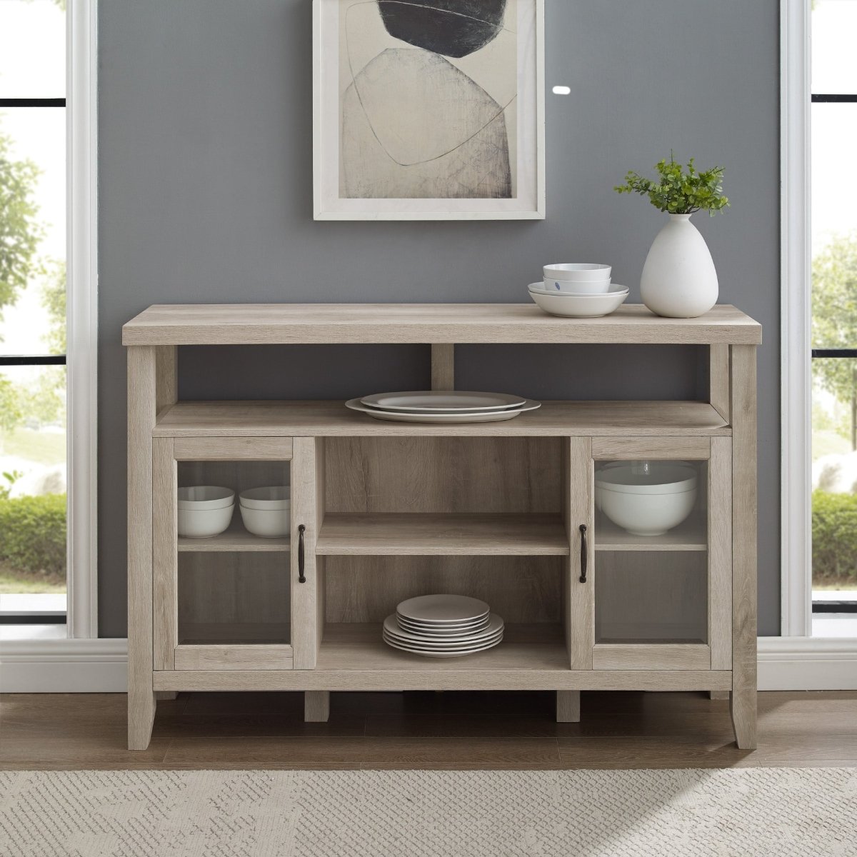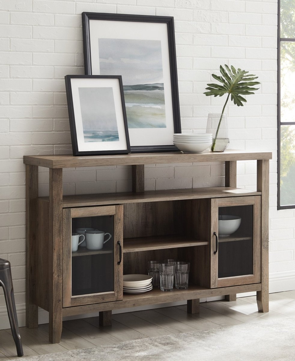 This high boy buffet console has a modern twist on a traditional piece. With a wide and roomy shelf above the storage cabinets, this inverted design will add a dose of individuality. Constructed of high-grade MDF shelving, glass doors, and spacious cubbies, all you have to choose is the color; available in beautiful Dark Walnut, rustic Barnwood, or modern Grey Wash.