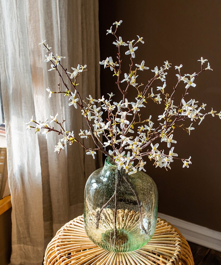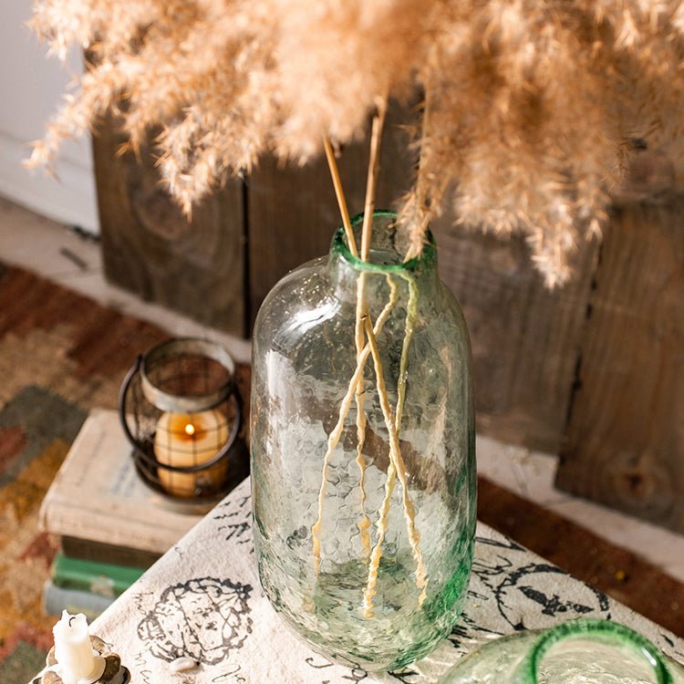 The irregular shape and generous openings accommodate various floral arrangements, from single statement stems to abundant bouquets. The clear and green glass tones complement both fresh and dried botanicals without overwhelming them. Display empty as a sculptural object or filled with your choice of flowers and stems (not included).