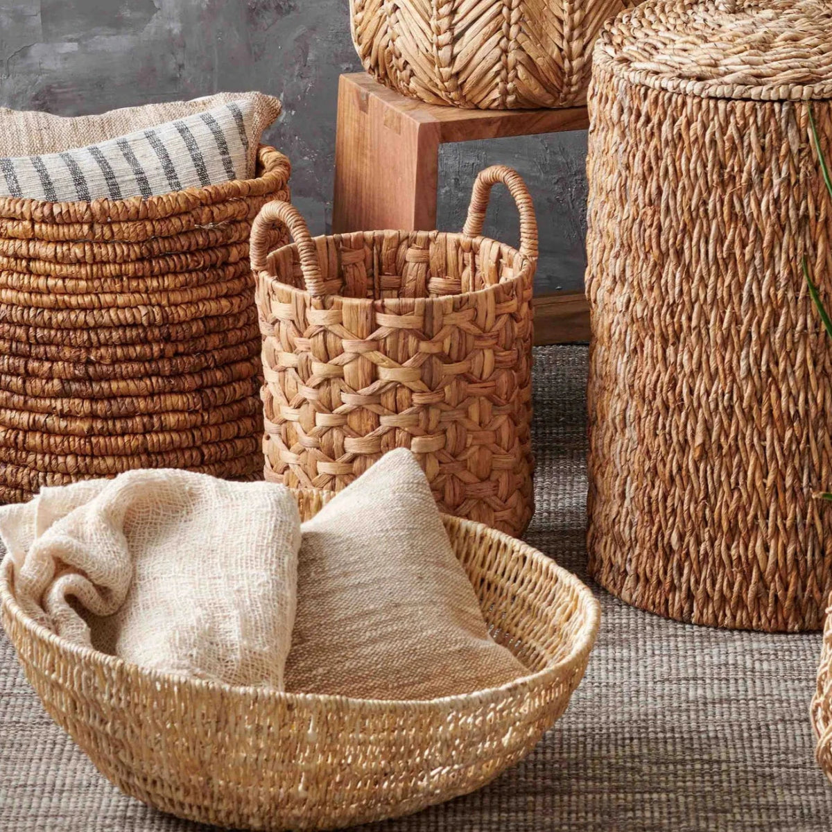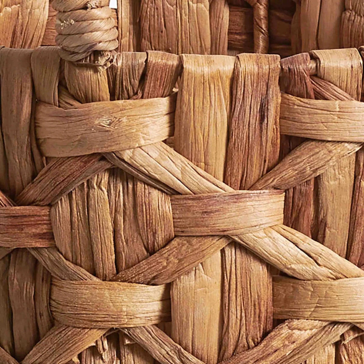 Water hyacinth is a sustainable, fast-growing aquatic plant that creates durable woven products. The natural fiber provides breathability, making these baskets ideal for storing textiles and linens. The material's organic texture and neutral tones work with various interior styles, from coastal to bohemian to minimalist designs.