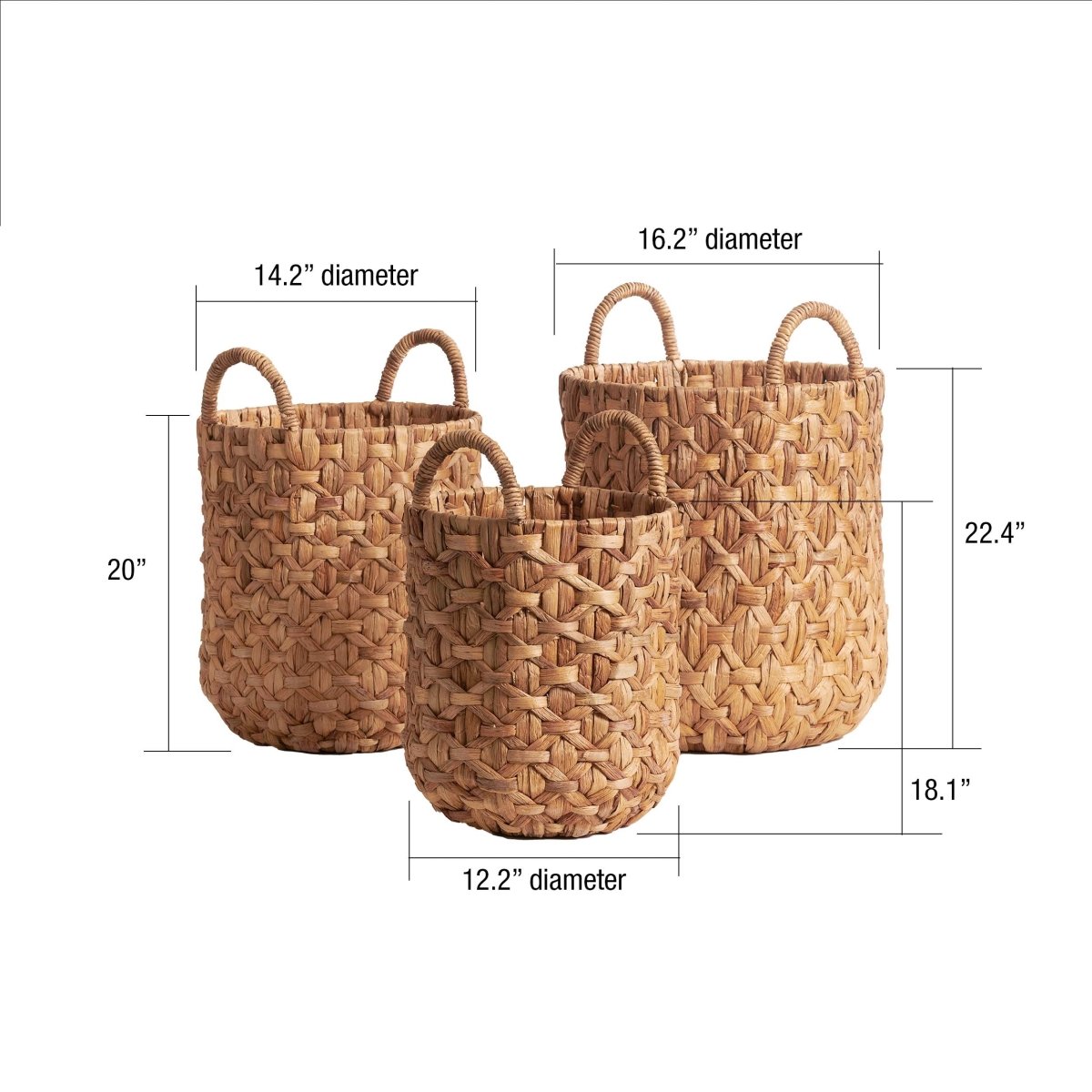 This set of three hand-woven water hyacinth baskets combines functional storage with natural aesthetic appeal. Each basket features intricate woven patterns created by skilled artisans, offering a practical solution for organizing household items while adding texture to your space.
