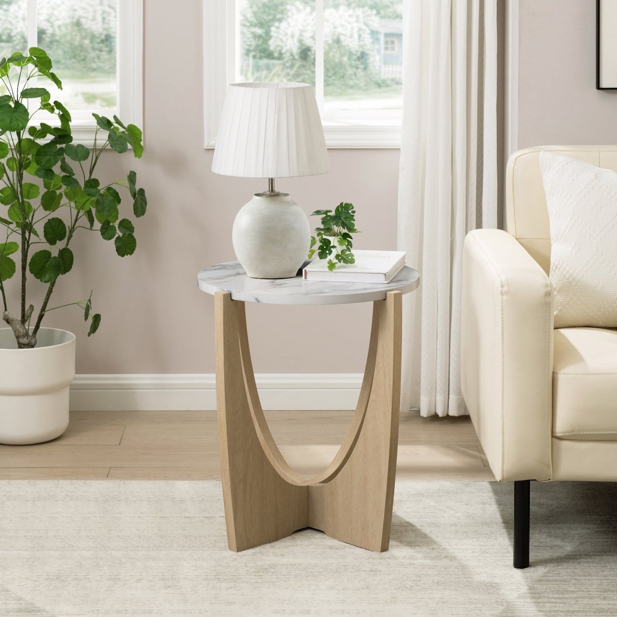 Style a sleek space with this modern marvel. A unique, open, crossed-arch base will help make this side table the star of the show in your living room, home office, or personal space. Situate it between two armchairs, sitting couch side, or pair it with the matching coffee table for a harmonious abode. The mixed-material design and lightweight frame make for a simple yet statement-making display perfect for apartments or sprawling spaces.