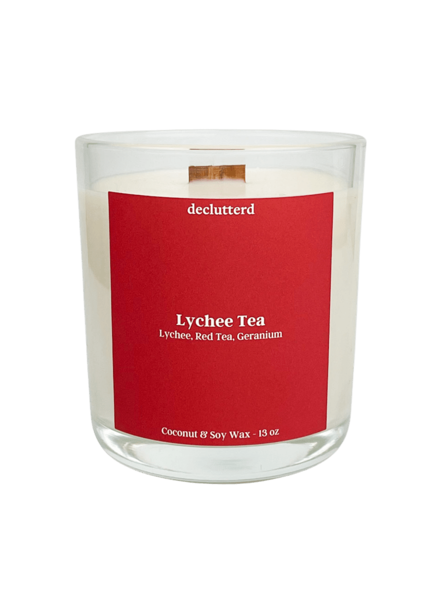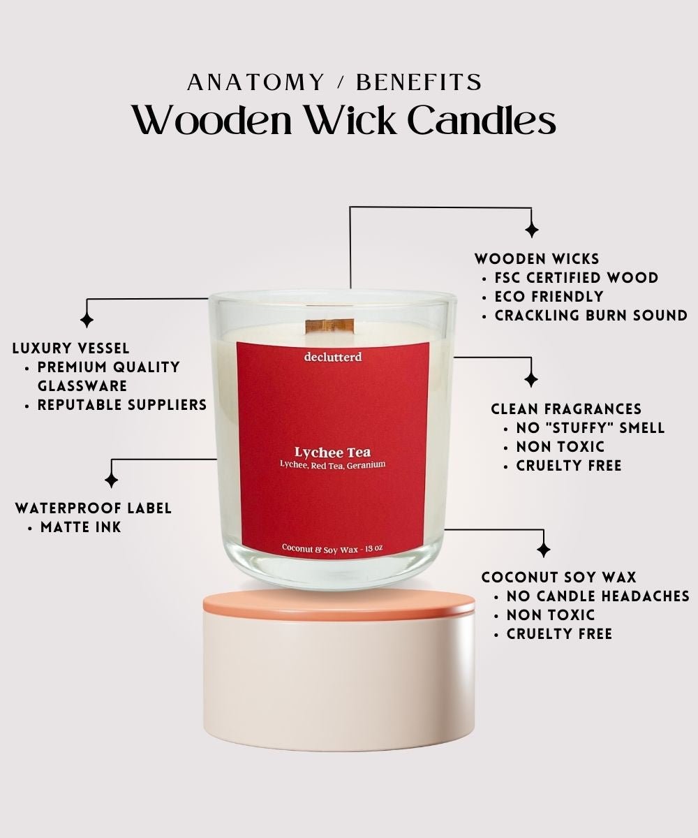 This wood wick candle combines the bright, fruity notes of lychee with the mellow warmth of red tea. The blend includes geranium and lily accents that round out the fragrance profile. The wooden wick produces a soft crackling sound while burning.