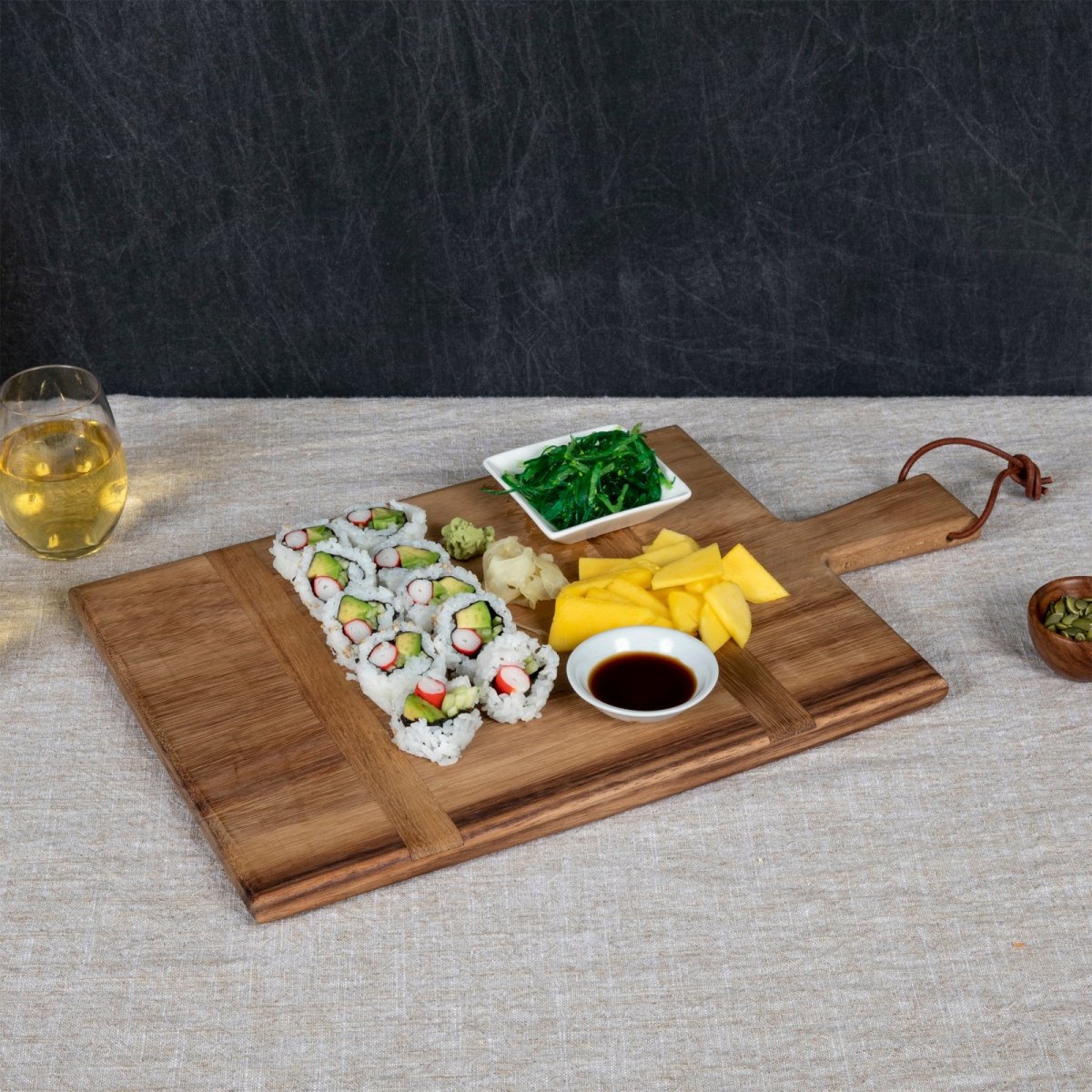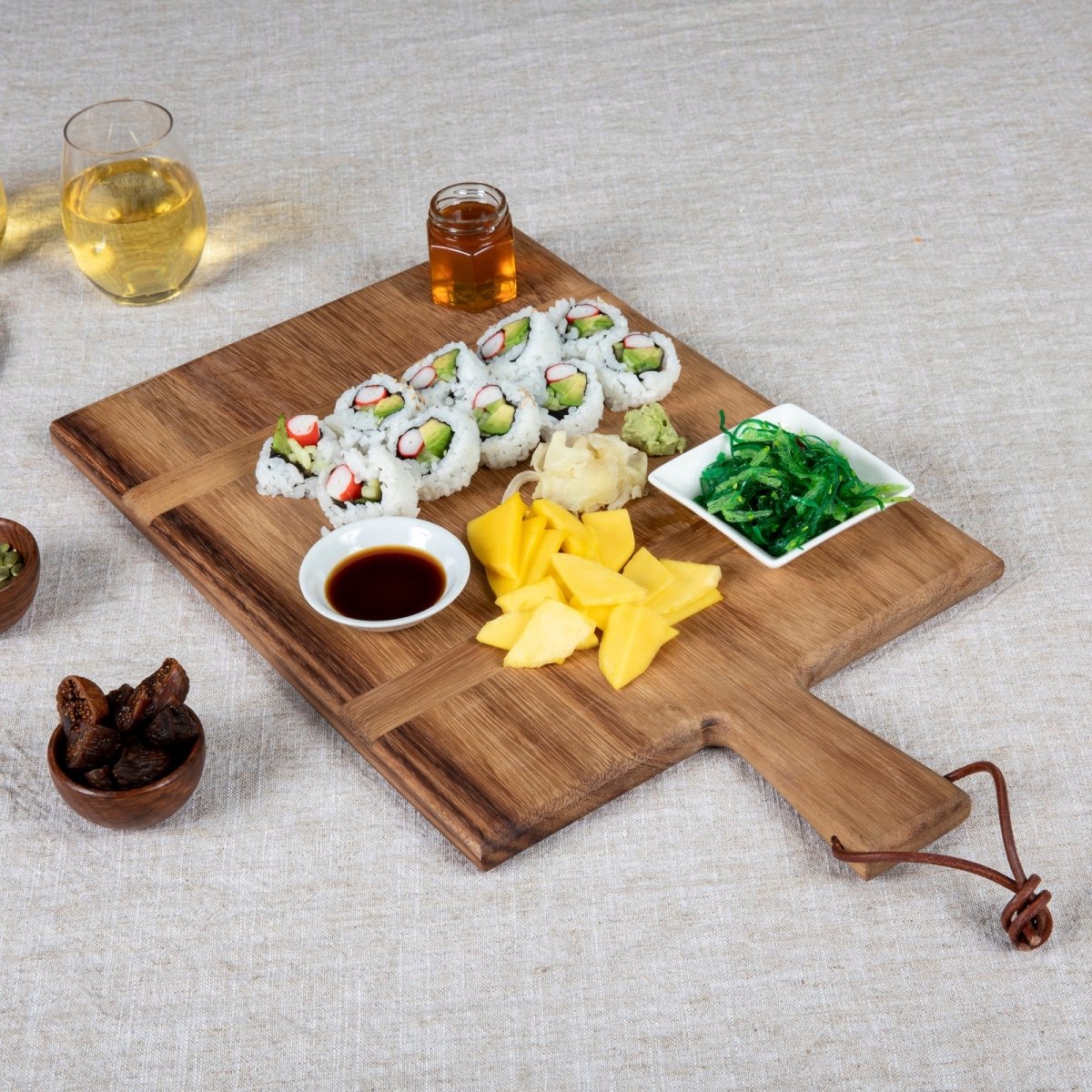 Regular price $79.95The Madera Rectangle Charcuterie Board is a Caribbean walnut wood serving tray fit for the finest tables. Cheese, charcuterie, appetizers, and more are displayed to perfection on this large, just-past-square wooden cutting board made just-for-you in Mexico with striking timber stripes. The handle doesn’t just make service easier, the attached leather rope also allows you to display the beautiful natural wood grain on the wall between uses.