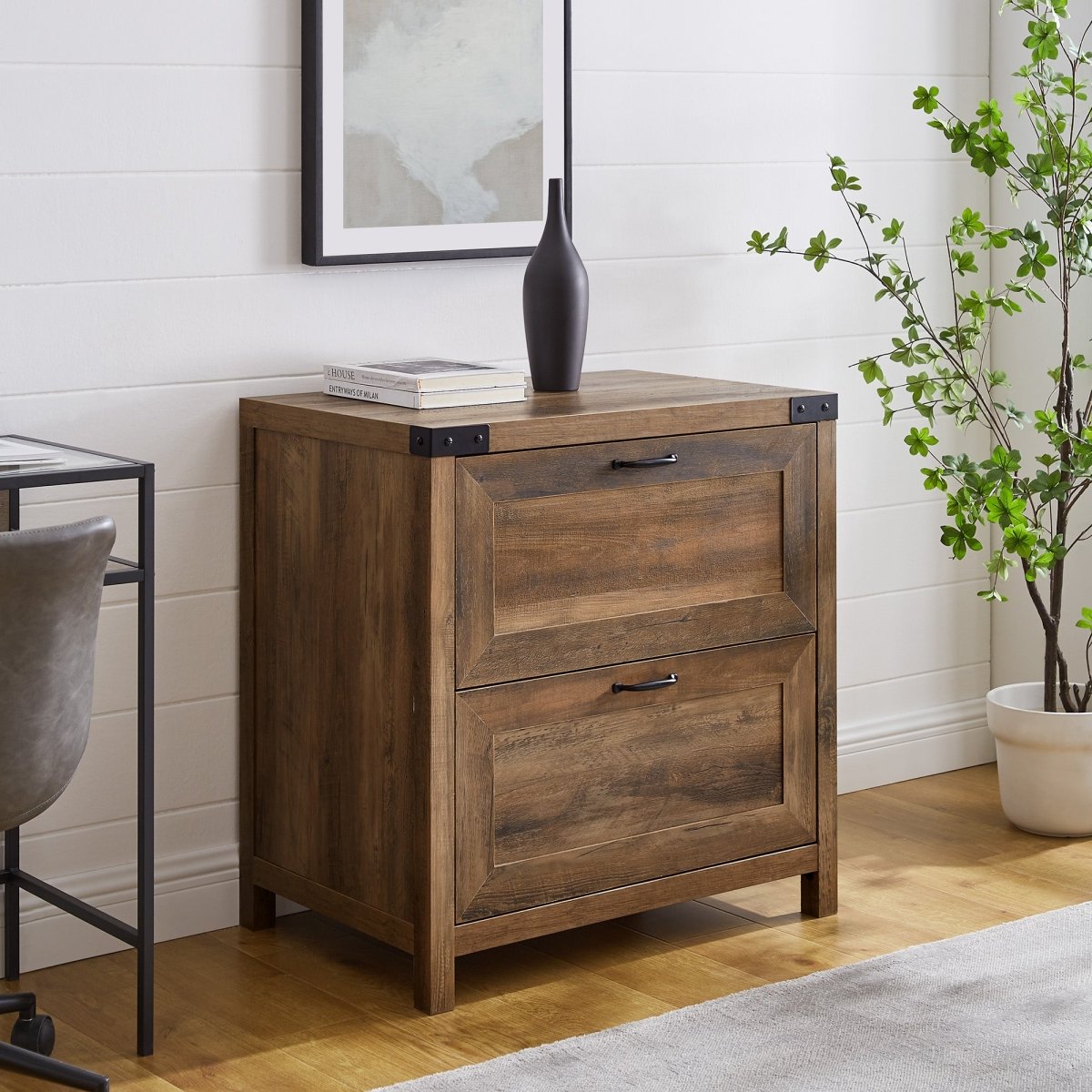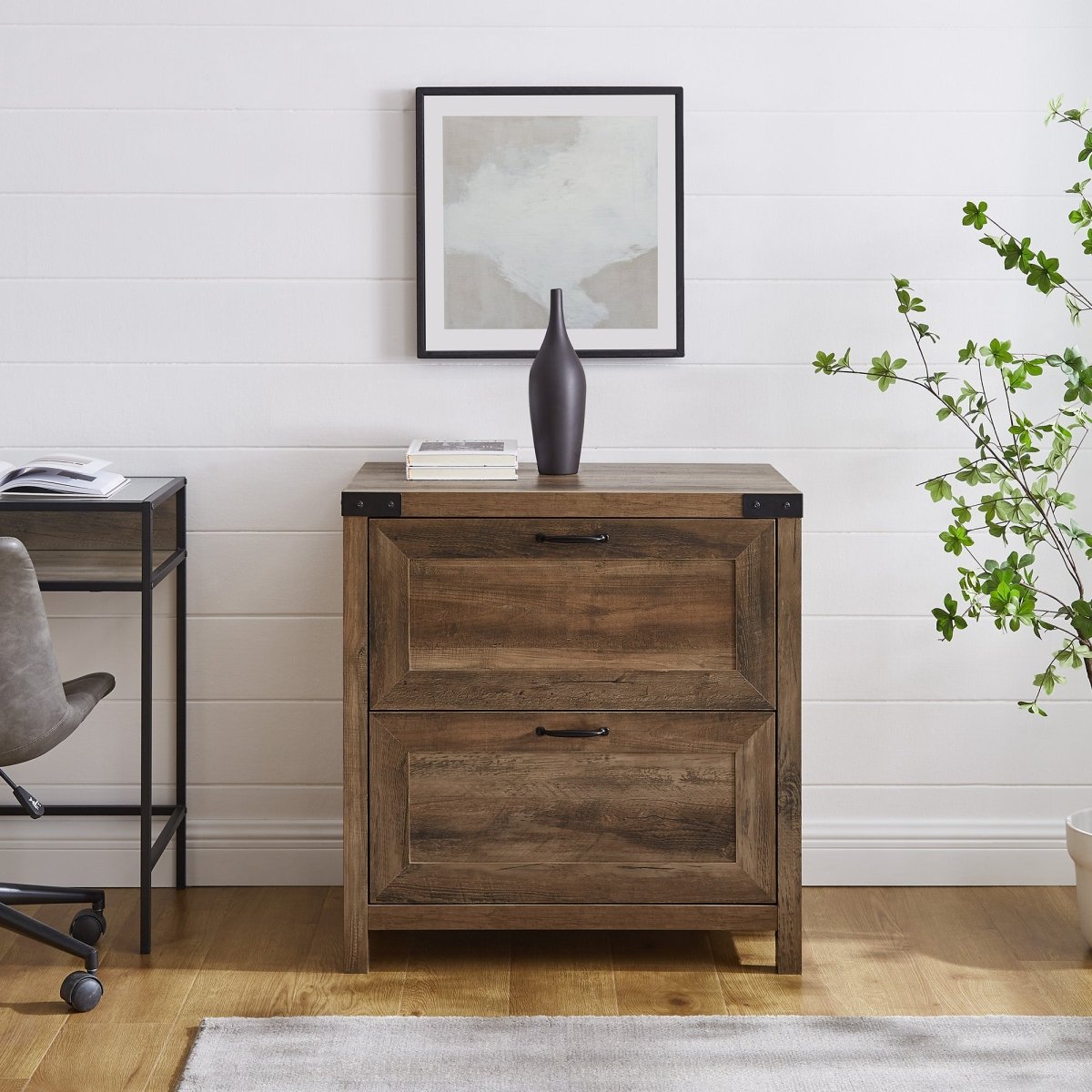 Add great style to the files when you organize with this two-drawer accent cabinet. Reflect your cozy-country interior style and methodical personality all in one piece with the cabinet’s tasteful touches, like metal accents and drawers fit with dividers to arrange legal-size folders. Its timeless silhouette will accentuate any home office interior, from boho-inspired to modern farmhouse. Use the filing cabinet’s generous surface space to organize décor, and utilize the two drawers on smooth, metal glides to effortlessly organize the chaos in your work-from-home haven.