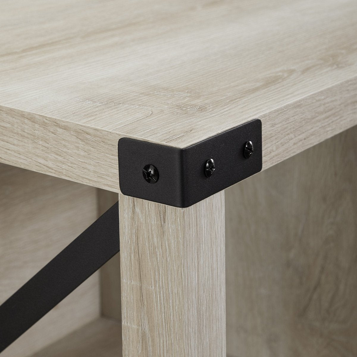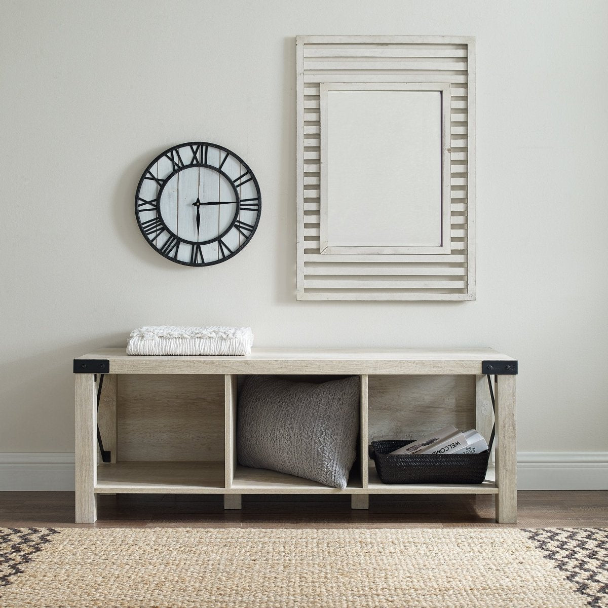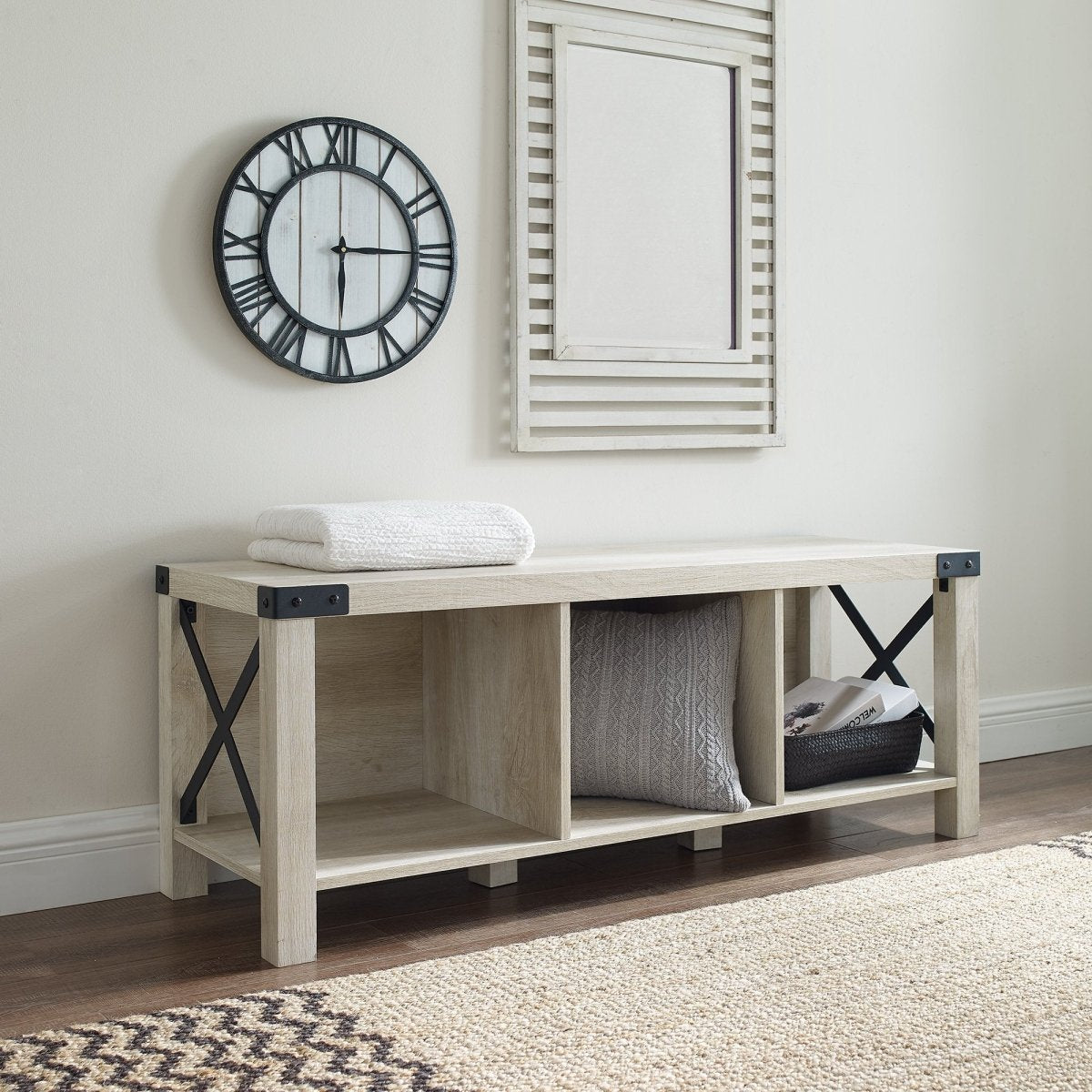 Usher in this storage friendly farmhouse bench into any number of places in your home. It’s a great addition in the entryway, at the foot of a bed, or in your living room because it provides extra seating and accommodates space saving needs. The three cubbies fit most standard size bins. The charm of this bench continues with its metal accents. With riveted angle details on the top corners and black metal X’s on the sides, you’ll get a rustic feel that transforms this bench into so much more than mere wood and metal.