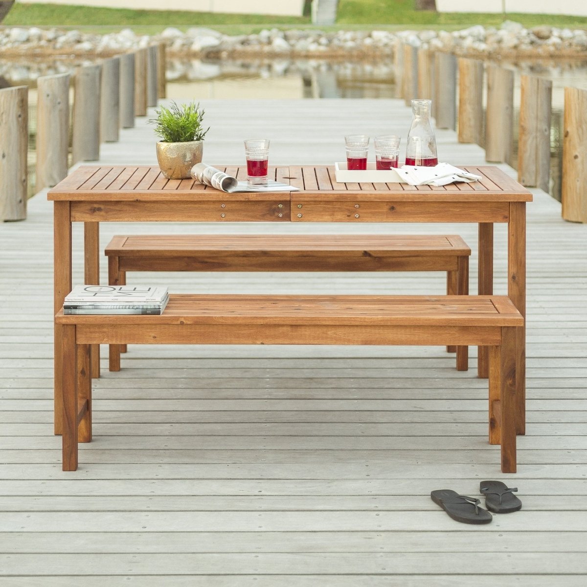Regular price $279.00Create an additional dining space on any deck or patio with this charming patio 3-piece dining set. Constructed from solid acacia hardwood, this set is naturally sturdy yet stylish. Entertain additional guests with the hide-away butterfly leaf and three-seater benches. Relax and enjoy the outdoors with this exceptional dining set which includes two benches and table.