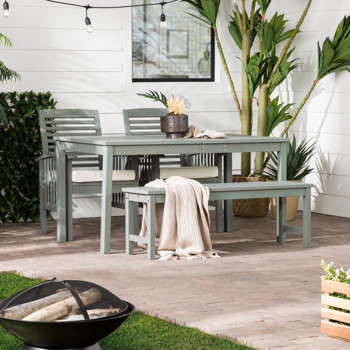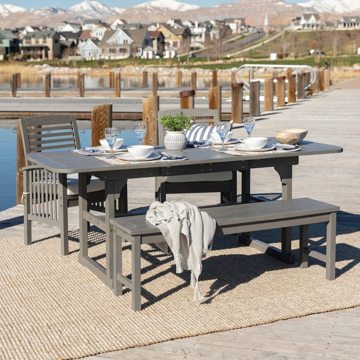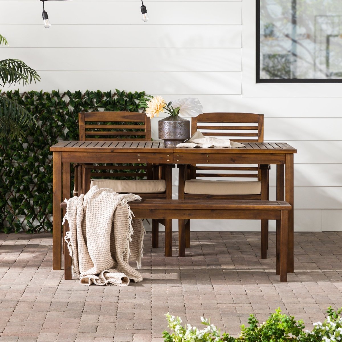 Regular price $331.00Classic and comfortable, you'll be impressed by this timeless outdoor patio dining set. The slat pattern on every piece provides a fresh and stylish take on outdoor furniture while the weather resistant cushions provide support. The table includes a butterfly leaf extension that has a hole that can accommodate an outdoor umbrella. This dining set includes one extendable table, one bench and two chairs.