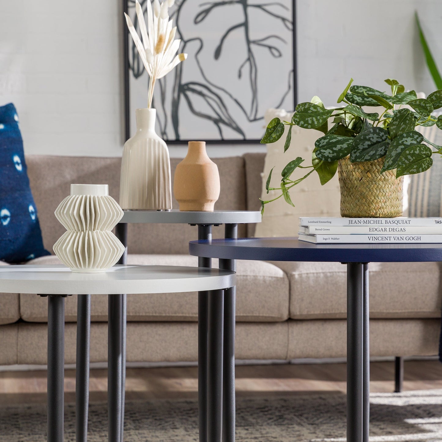 Regular price $51.00A versatile living room starts with this Modern Round Nesting Coffee Tables with Tapered Legs. The three tables can tuck underneath one another create more room in front of the couch or accommodate small spaces. Spread the tables apart to fill out the area and add more surfaces to place drinks, snacks, or decorations. This trio of occasional tables features tapered metal legs for a subtle Mid-century modern touch to your contemporary living room.